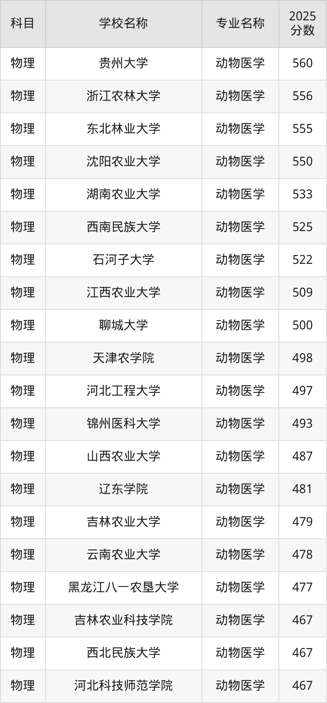 在直接以“动物医学”的名称招生的内蒙古自治区大学中,内蒙古农业大学的分数线最高、排名第一名,在物理组的最低分是500分,全自治区排名前29780位的高考生才有较大机会被录取。