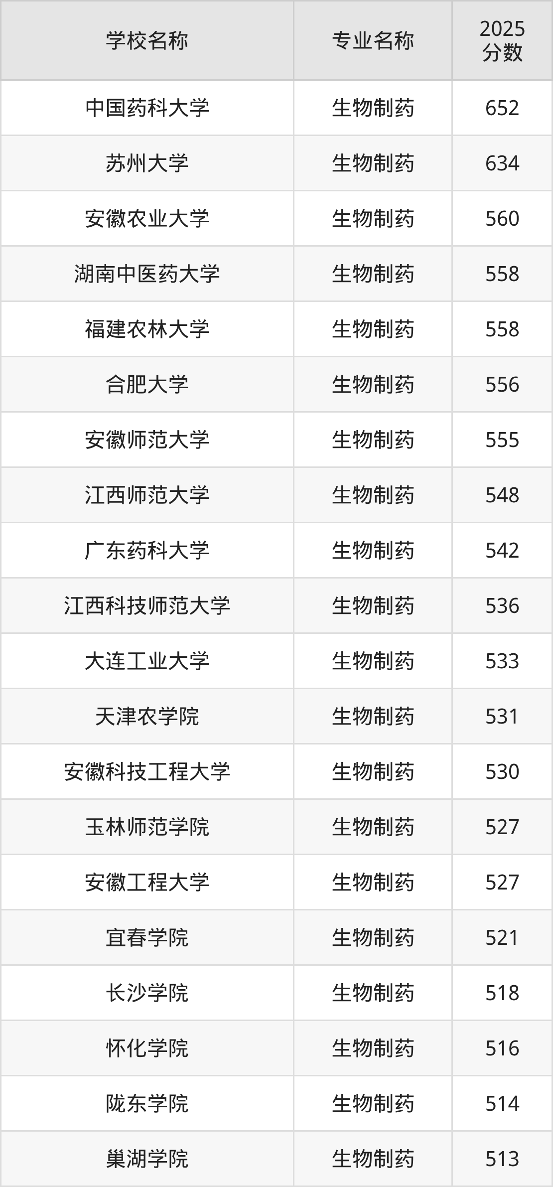 通过上文大家可以知晓,在浙江省内招生物制药专业的院校数量较少,所以下文将为2026届高考生继续展示:省外大学的生物制药专业2025年在浙江高考的录取情况,包含中国药科大学、苏州大学、安徽农业大学、湖南中医药大学、福建农林大学。