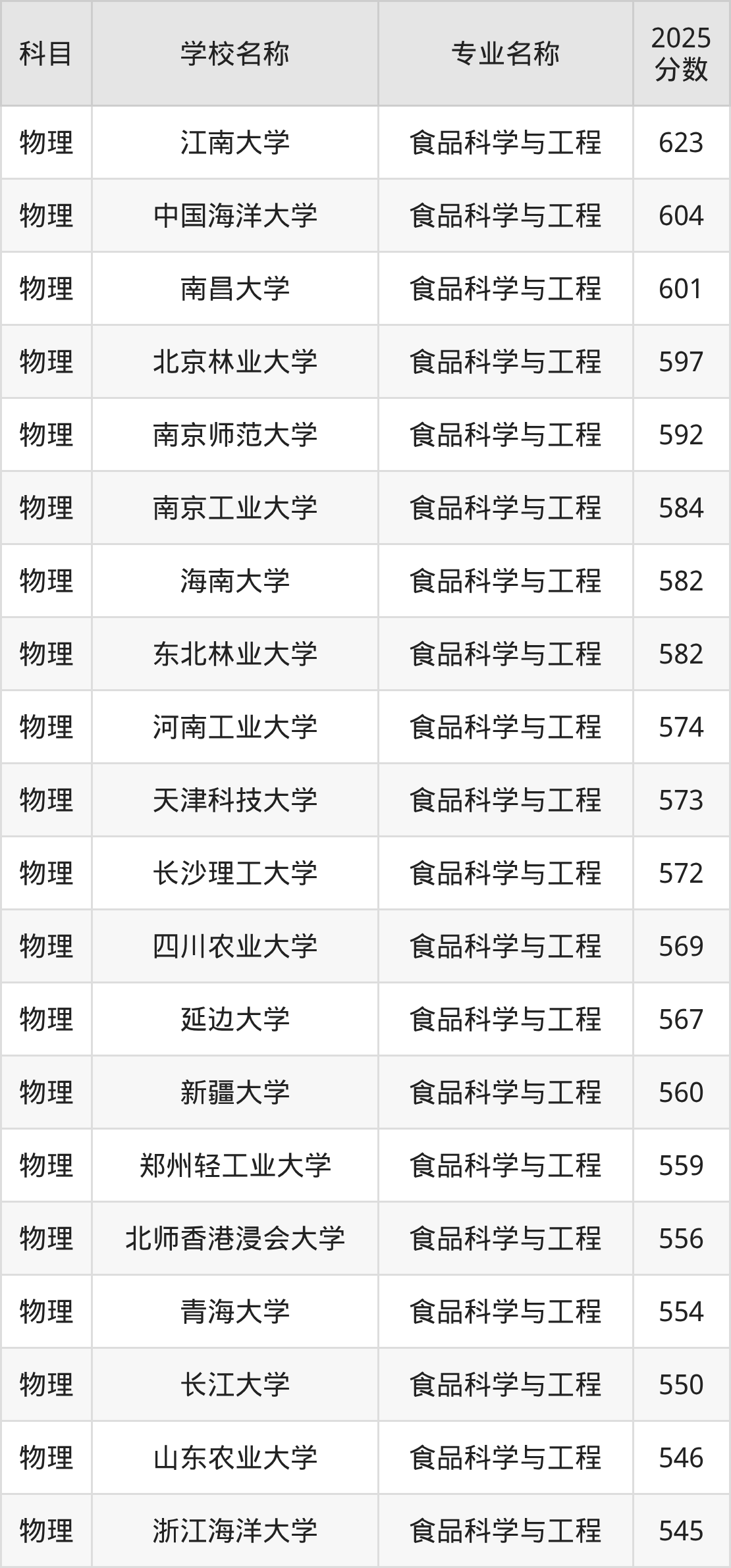 通过上文大家可以知晓,在辽宁省内招食品科学与工程专业的院校数量较少,所以下文将为2026届高考生继续展示:省外大学的食品科学与工程专业2025年在辽宁高考的录取情况,包含江南大学、中国海洋大学、南昌大学、北京林业大学、南京师范大学。
