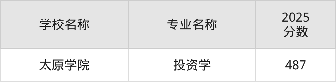 在直接以“投资学”的名称招生的山西省大学中,太原学院的分数线最高、排名第一名,在历史组的最低分是491分,全省排名前22825位的高考生才有较大机会被录取。