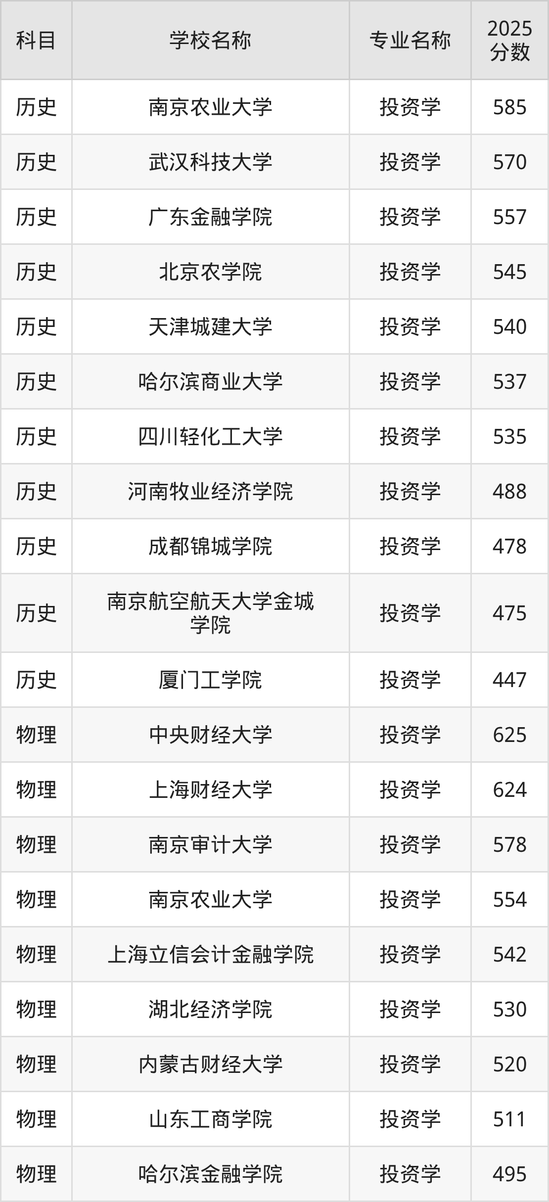 通过上文大家可以知晓,在山西省内招投资学专业的院校数量较少,所以下文将为2026届高考生继续展示:省外大学的投资学专业2025年在山西高考的录取情况,包含南京农业大学、武汉科技大学、广东金融学院、北京农学院、天津城建大学。