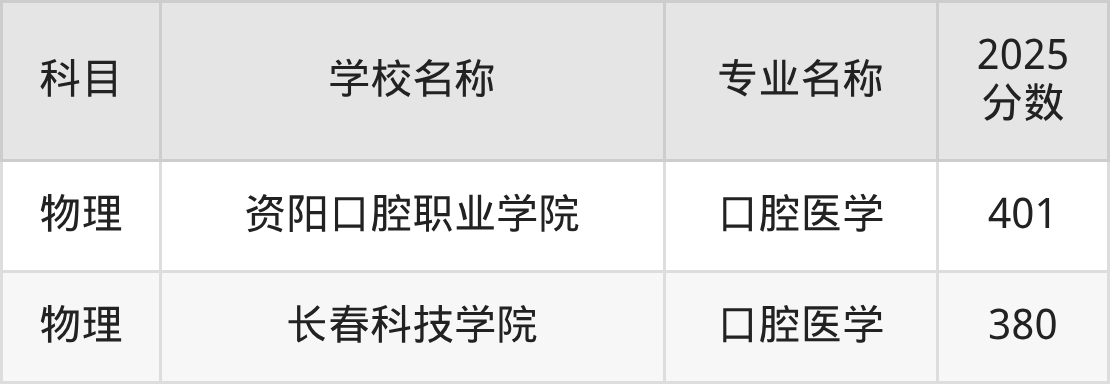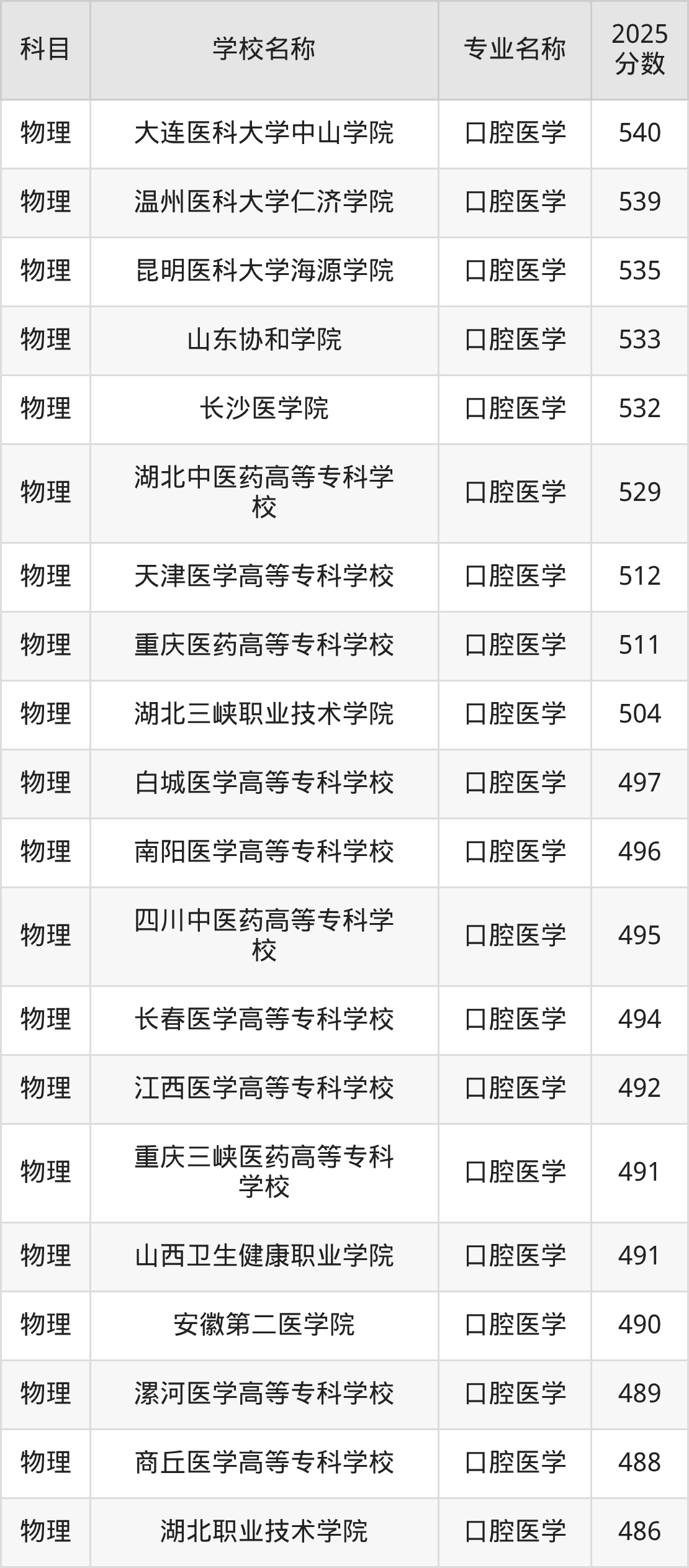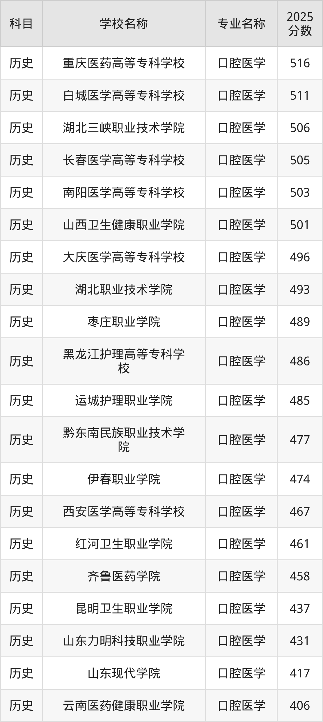 通过上文大家可以知晓,在河北省内招口腔医学专业的院校数量较少,所以下文将为2026届高考生继续展示:省外大学的口腔医学专业2025年在河北高考的录取情况,包含重庆医药高等专科学校、白城医学高等专科学校、湖北三峡职业技术学院、长春医学高等专科学校、南阳医学高等专科学校。