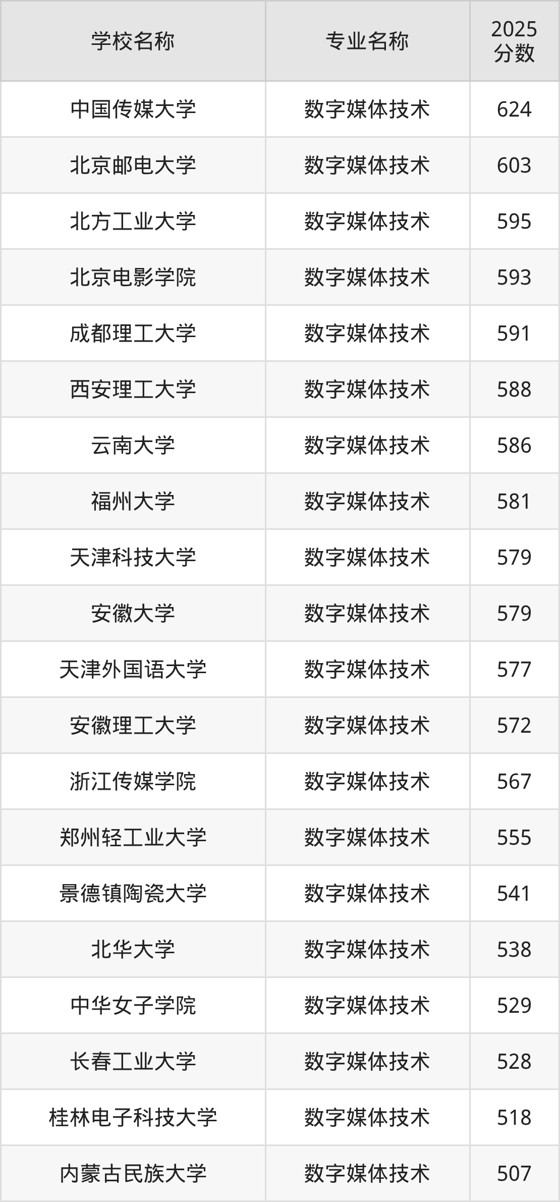通过上文大家可以知晓,在山东省内招数字媒体技术专业的院校数量较少,所以下文将为2026届高考生继续展示:省外大学的数字媒体技术专业2025年在山东高考的录取情况,包含中国传媒大学、北京邮电大学、北方工业大学、北京电影学院、成都理工大学。