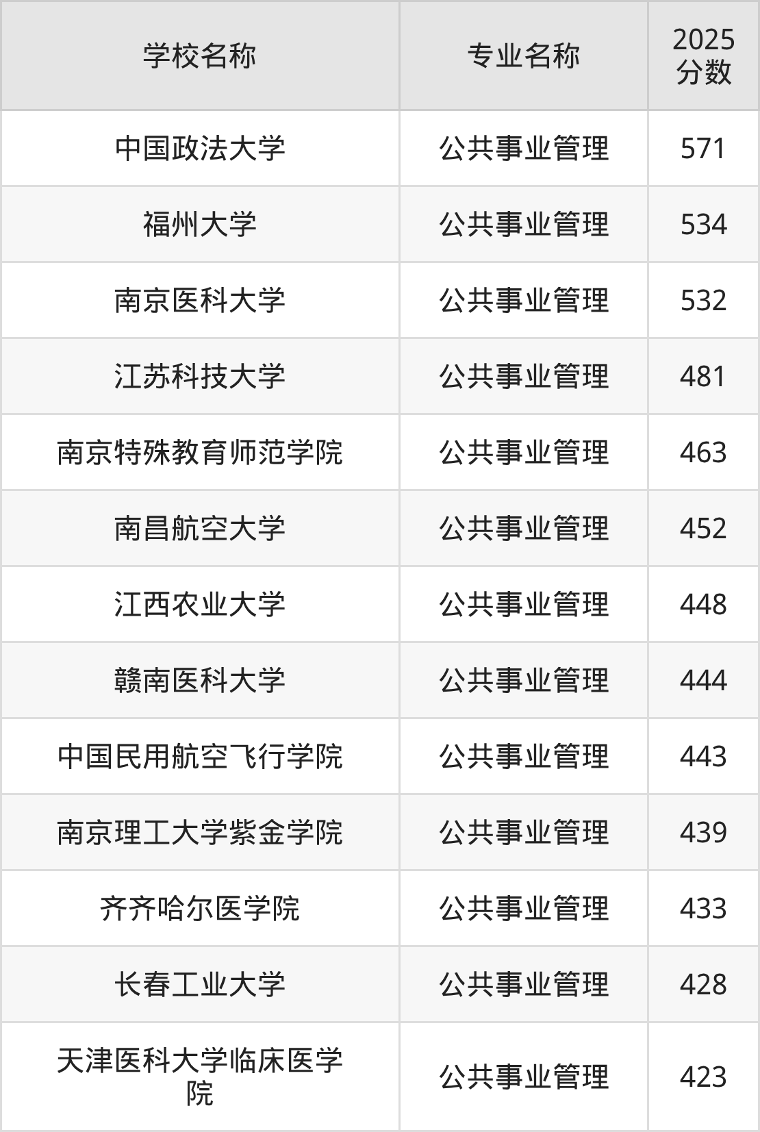 通过上文大家可以知晓,在上海市内招公共事业管理专业的院校数量较少,所以下文将为2026届高考生继续展示:市外大学的公共事业管理专业2025年在上海高考的录取情况,包含中国政法大学、福州大学、南京医科大学、江苏科技大学、南京特殊教育师范学院。
