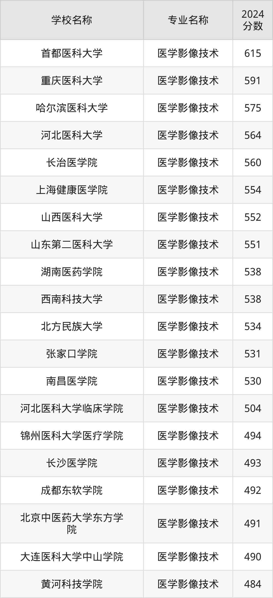 通过上文大家可以知晓,在天津市内招医学影像技术专业的院校数量较少,所以下文将为2026届高考生继续展示:市外大学的医学影像技术专业2024年在天津高考的录取情况,包含首都医科大学、重庆医科大学、哈尔滨医科大学、河北医科大学、长治医学院。