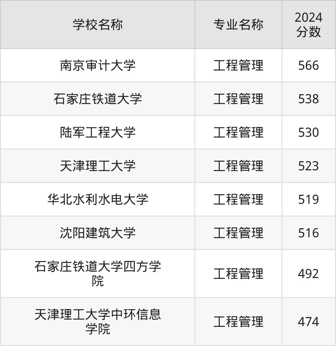 通过上文大家可以知晓,在北京市内招工程管理专业的院校数量较少,所以下文将为2026届高考生继续展示:市外大学的工程管理专业2024年在北京高考的录取情况,包含南京审计大学、石家庄铁道大学、陆军工程大学、天津理工大学、华北水利水电大学。