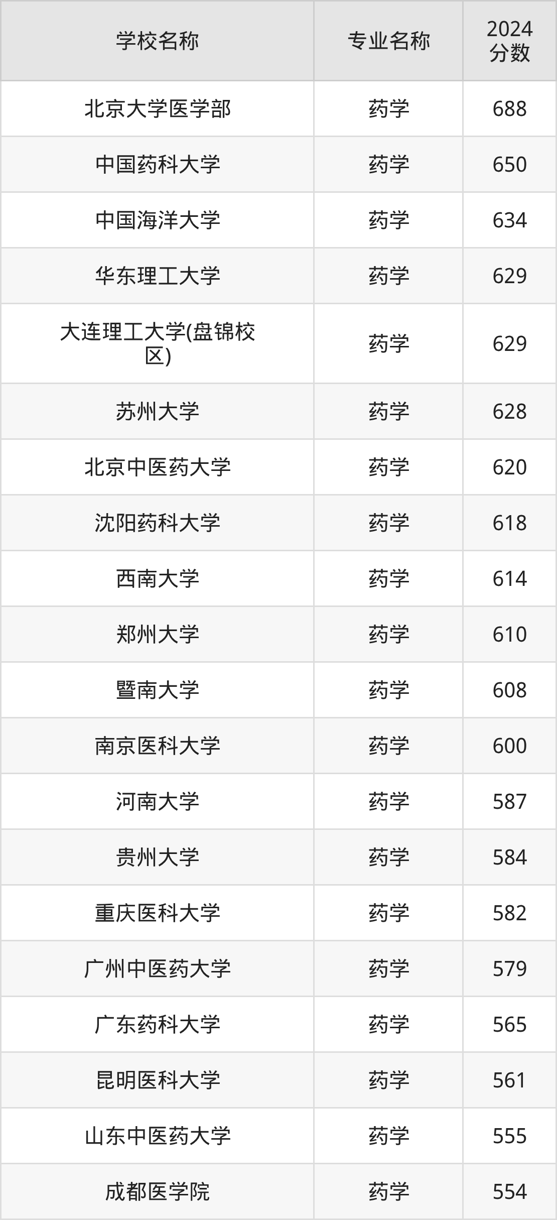 通过上文大家可以知晓,在天津市内招药学专业的院校数量较少,所以下文将为2026届高考生继续展示:市外大学的药学专业2024年在天津高考的录取情况,包含北京大学医学部、中国药科大学、中国海洋大学、华东理工大学、大连理工大学(盘锦校区)。