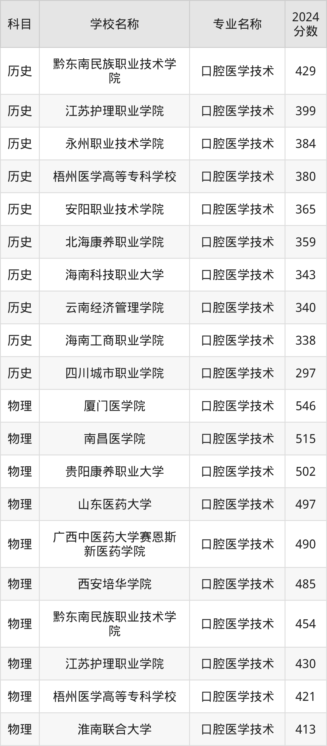 | 肇庆医学院 | 口腔医学技术 | 405 |