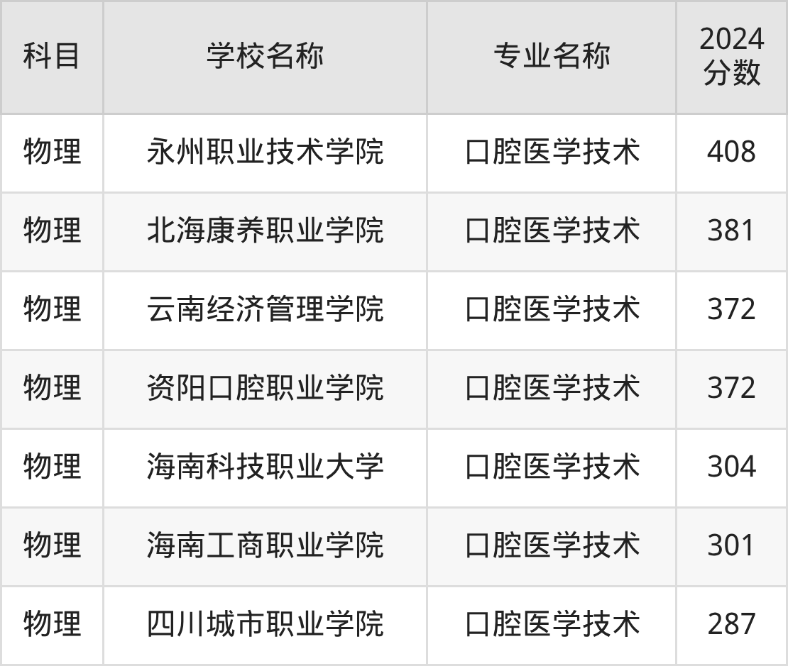 | 广东文理职业学院 | 口腔医学技术 | 285 |