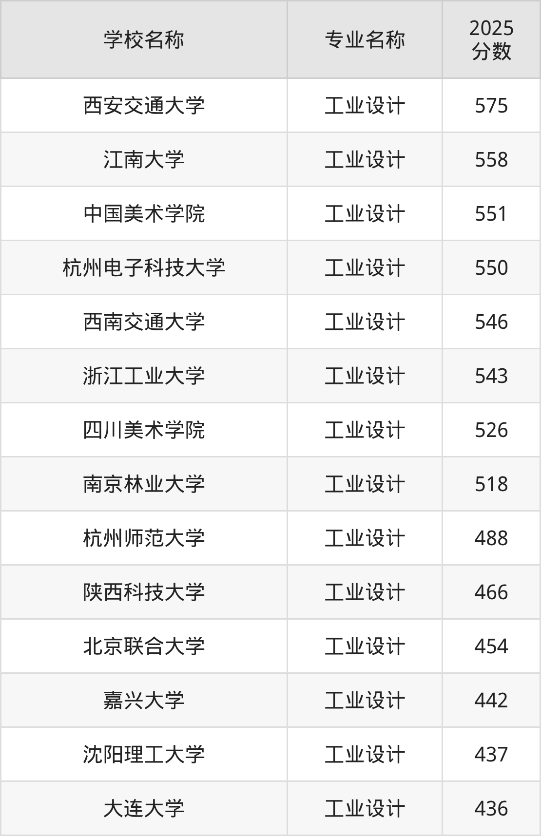 通过上文大家可以知晓,在上海市内招工业设计专业的院校数量较少,所以下文将为2026届高考生继续展示:市外大学的工业设计专业2025年在上海高考的录取情况,包含西安交通大学、江南大学、中国美术学院、杭州电子科技大学、西南交通大学。