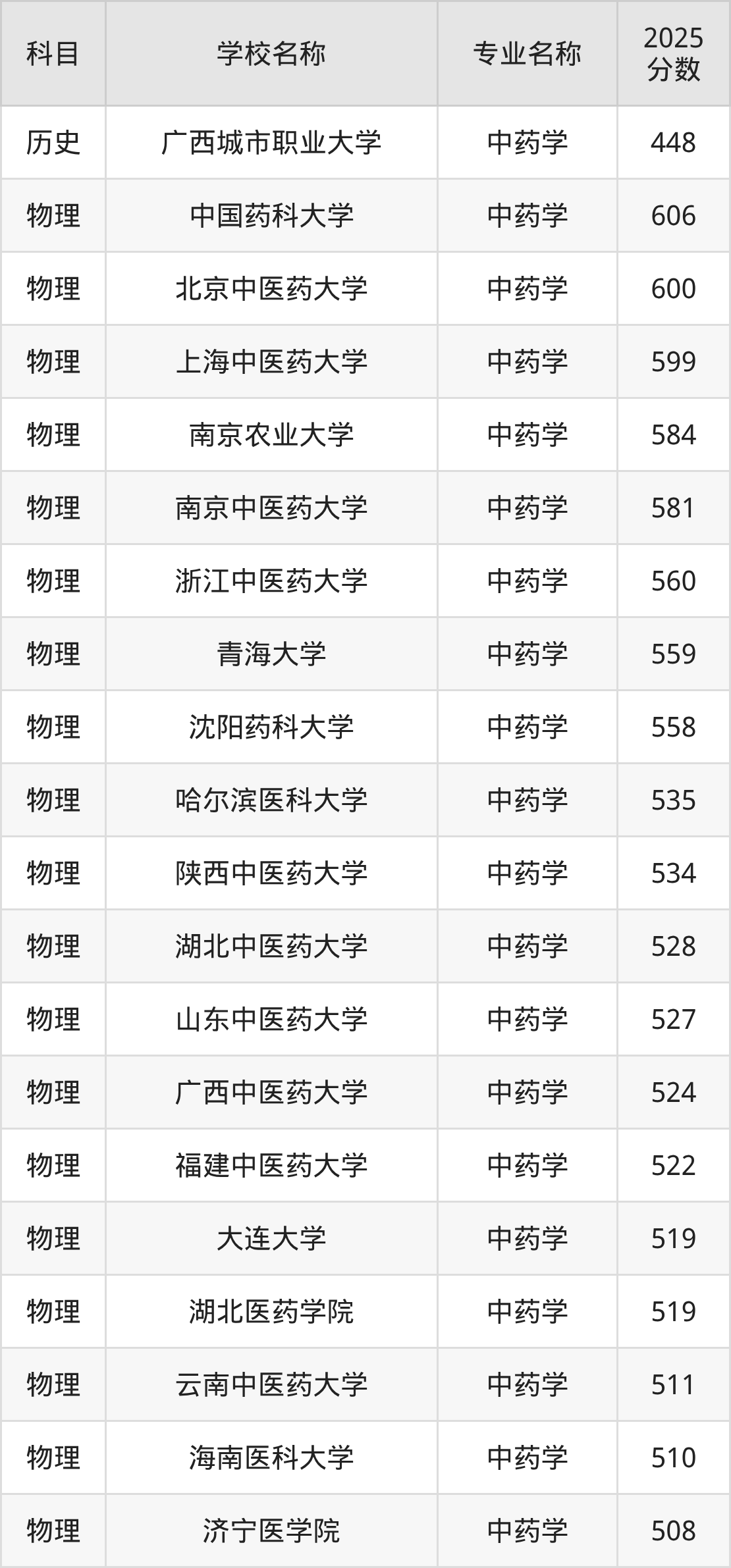 通过上文大家可以知晓,在山西省内招中药学专业的院校数量较少,所以下文将为2026届高考生继续展示:省外大学的中药学专业2025年在山西高考的录取情况,包含广西城市职业大学、中国药科大学、北京中医药大学、上海中医药大学、南京农业大学。