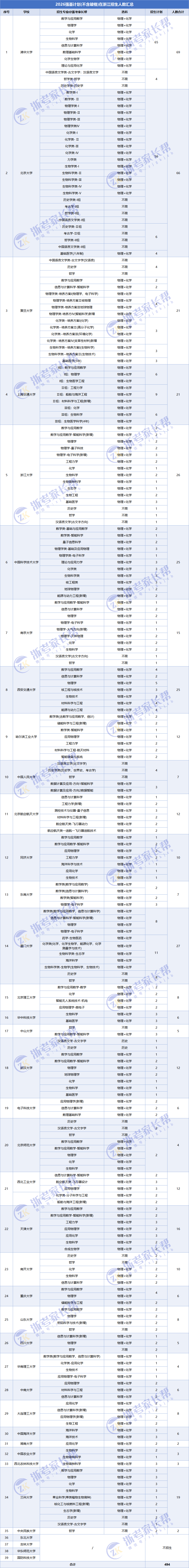 2026年,共有35所985高校在浙江省开展强基计划招生,总计划494人。