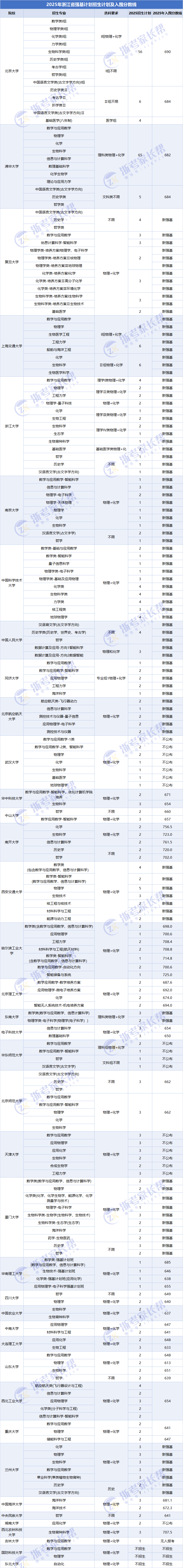 由于2026年强基计划校测尚未开始,各校2026年入围分数线尚未出炉。以下整理的是2025年部分强基高校在浙江的入围分数线,供考生参考定位。