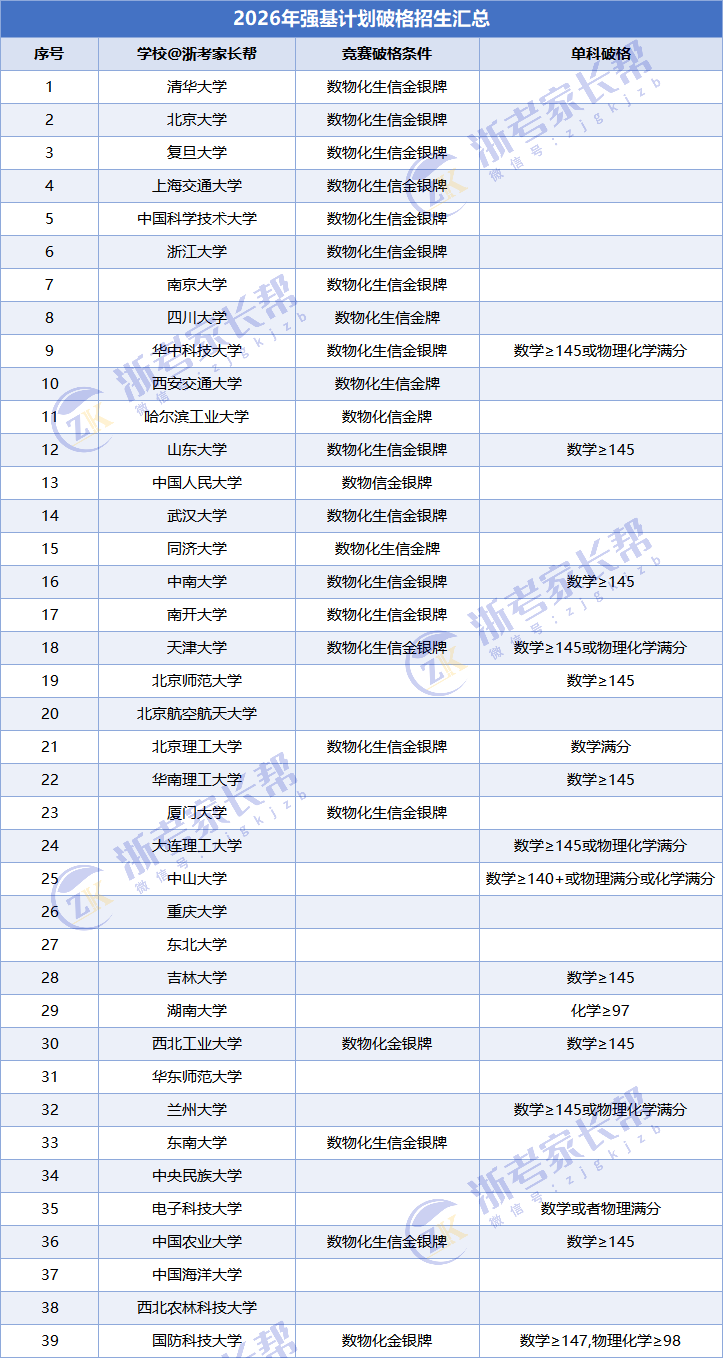 2026年39所强基高校中,15所院校有明显政策调整,涉及破格条件、校测方式、专业设置、综合成绩折算等,浙江考生需重点关注: