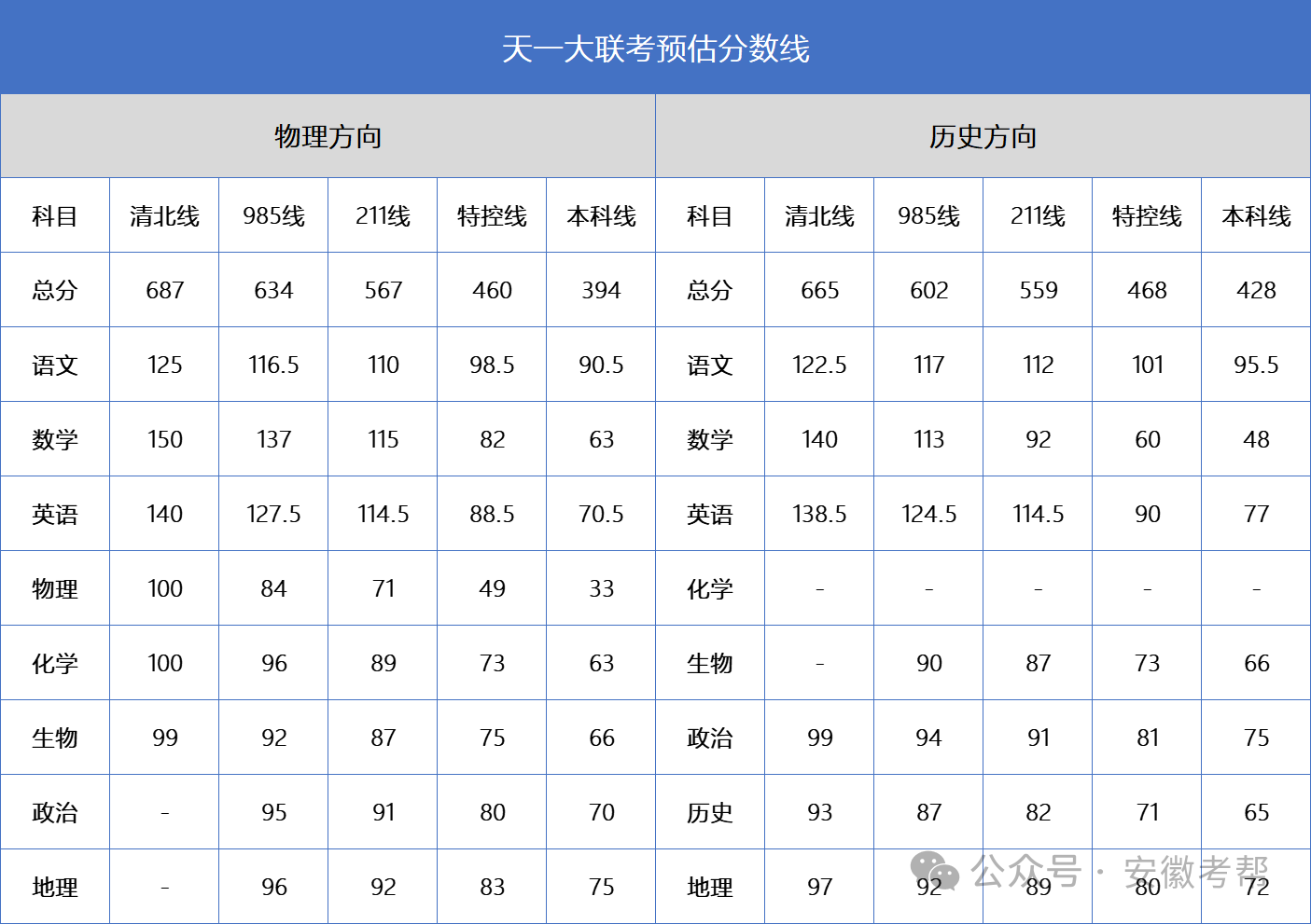 2026届安徽天一大联考高三11月期中考分数线已公布!其中,物理类清北线687分,985线634分,211线567分,特控线460分,本科线394分;历史类清北线665分,985线602分,211线559分,特控线468分,本科线428分。