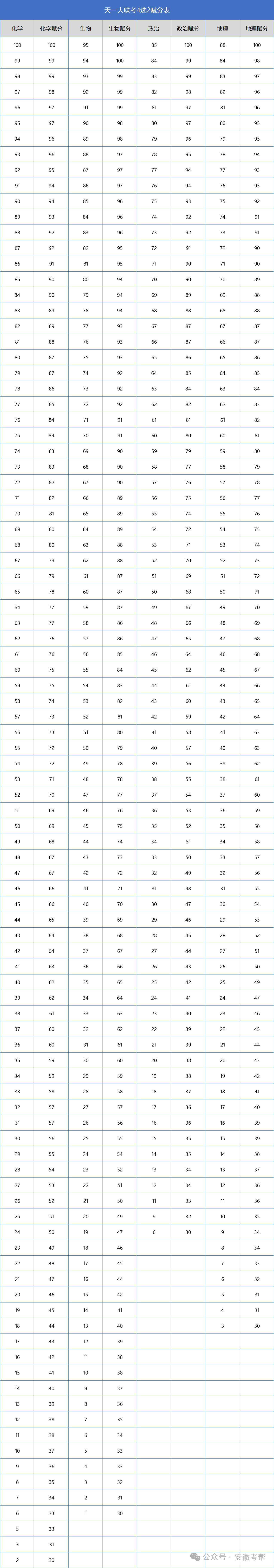 安徽高考再选科目(化学、生物、政治、地理)采用赋分制,即把考生原始成绩按比例划分等级,再换算成赋分成绩,以此保证不同科目间的公平性。以下是本次联考小四科的赋分情况: