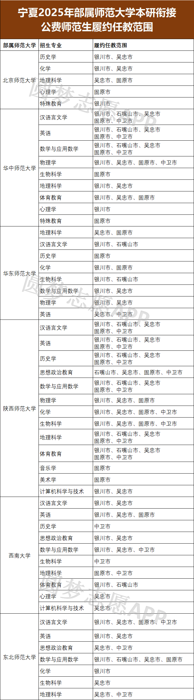 以下为2025年宁夏部属公费师范生履约任教区域整理,2026届考生在选择院校和专业时可重点参考。