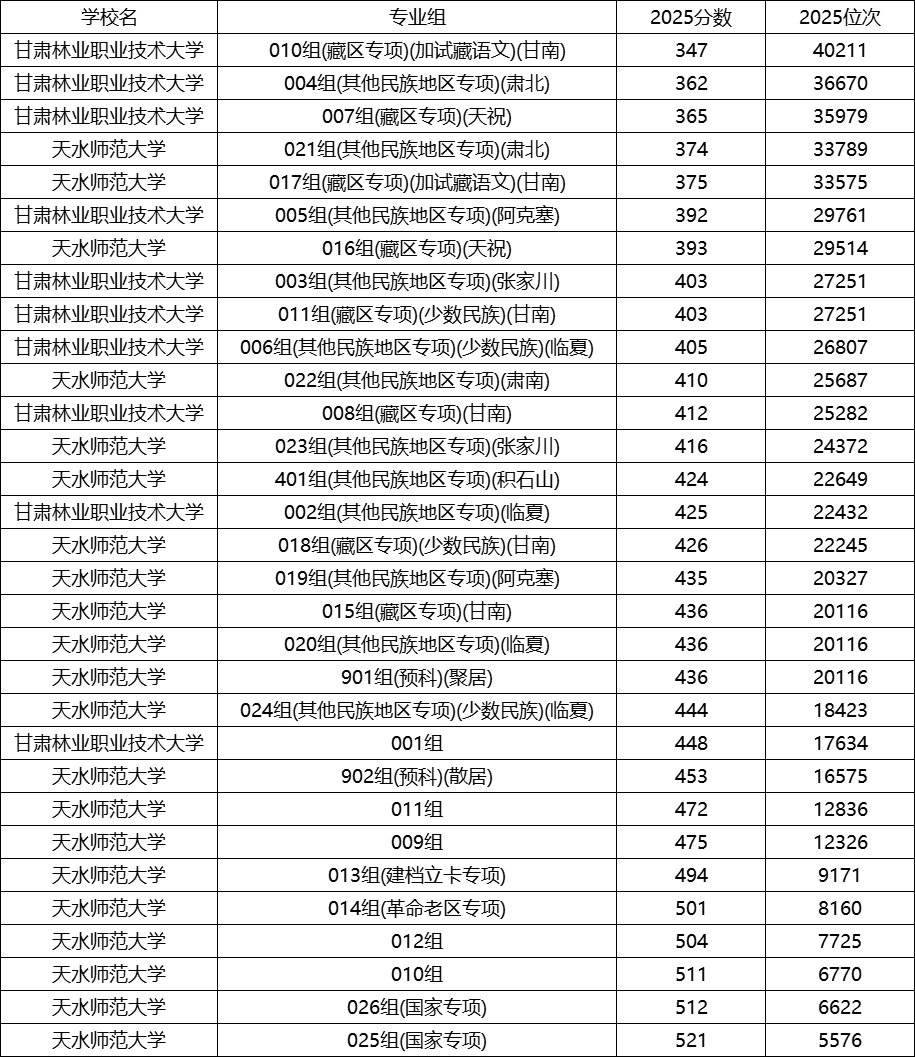 3.甘肃林业职业技术大学010组(藏区专项)(加试藏语文)(甘南)最低分:347分