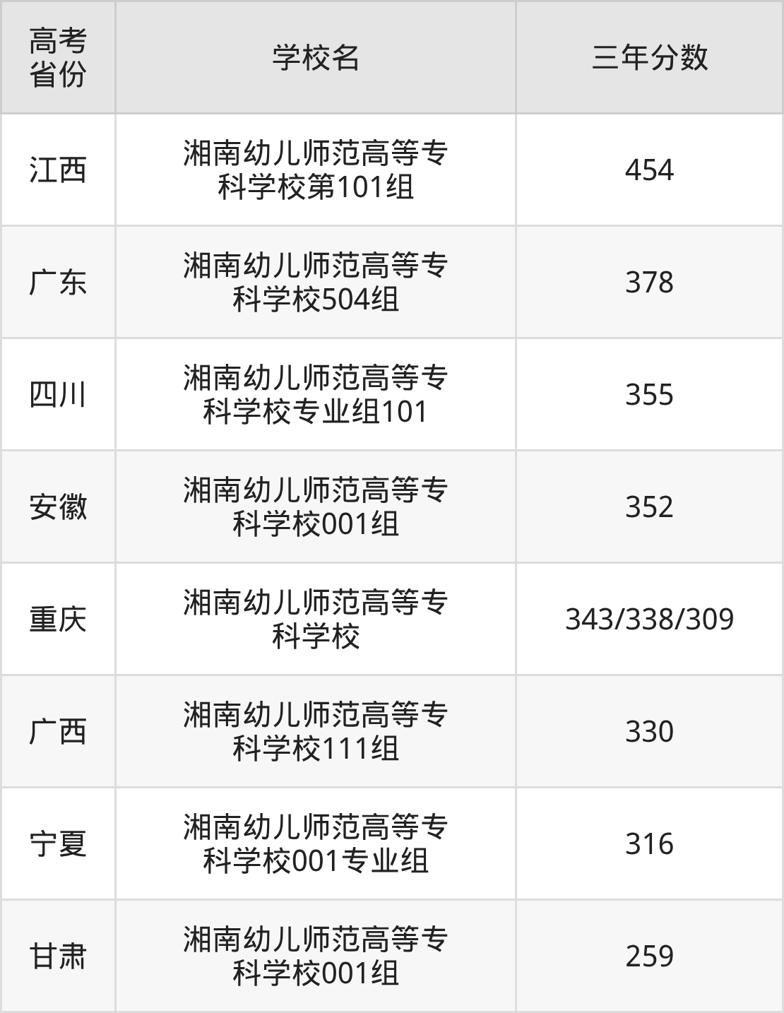 | 安徽 | 湘南幼儿师范高等专 科学校001组 | 337 |
