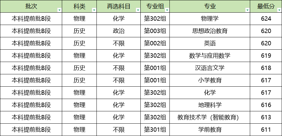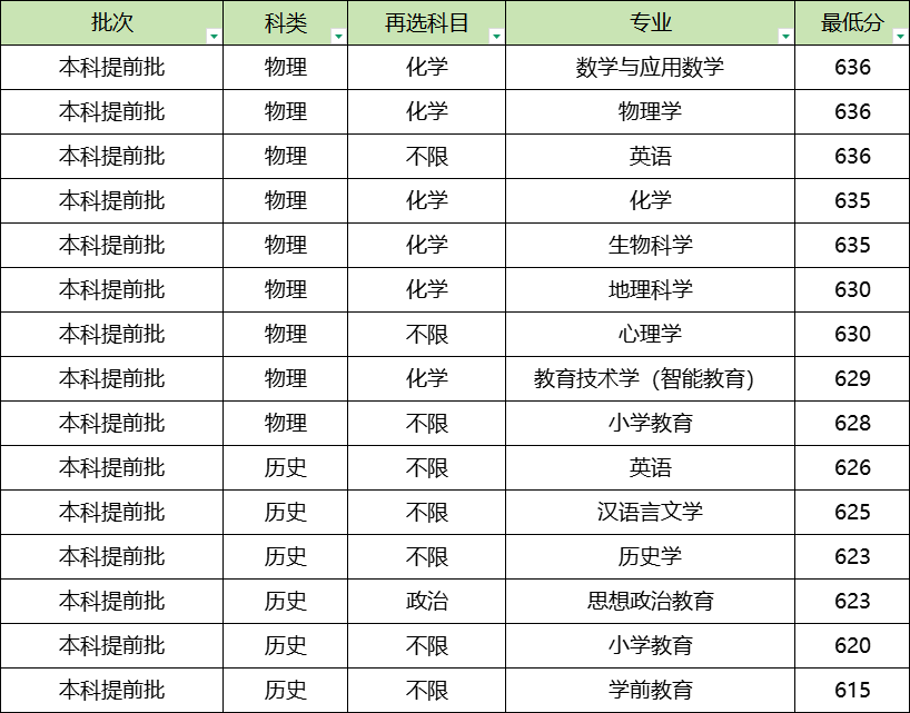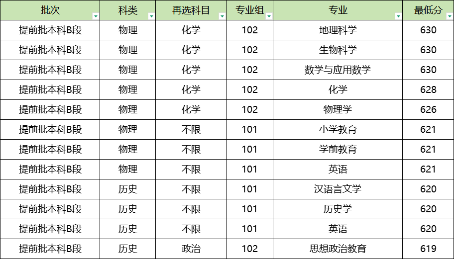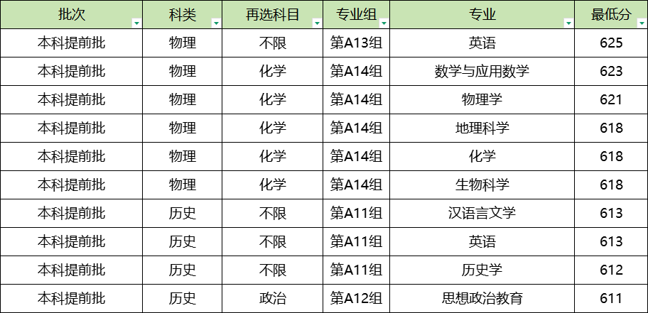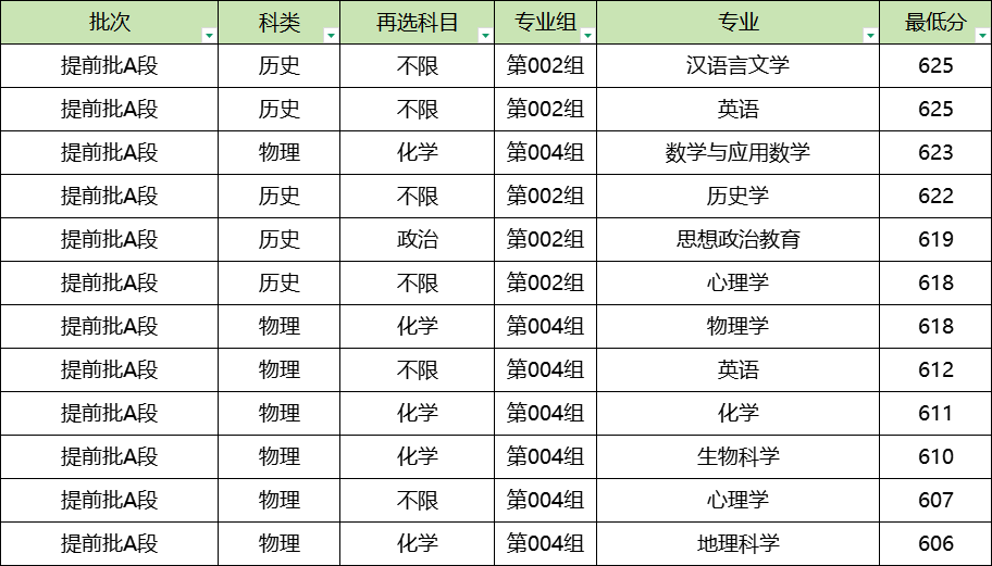 物理类分数在625-630分,历史类为604分。数学与应用数学专业最高630分,地理科学625分;历史类汉语言文学604分。