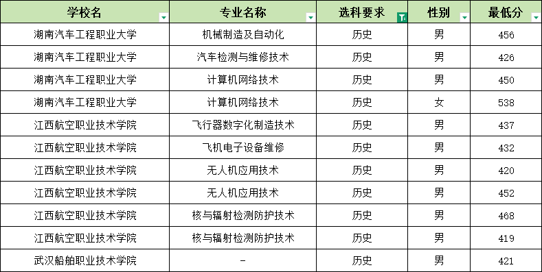 | 湖南汽车工程职业大学 | 历史 | 001专业组 | 419 |