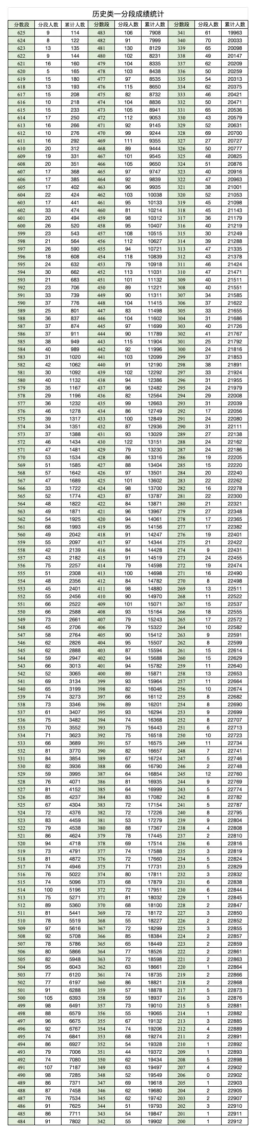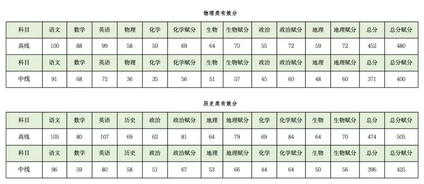 冲刺特控线(高线)则需要:语文107分、数学84分、英语105分、历史71分,赋分科目政治80分、地理77分、化学60分、生物66分。