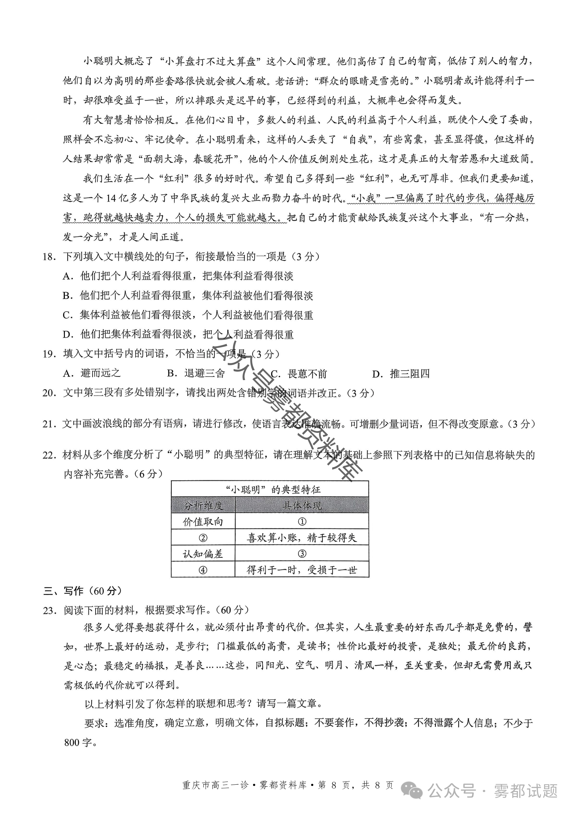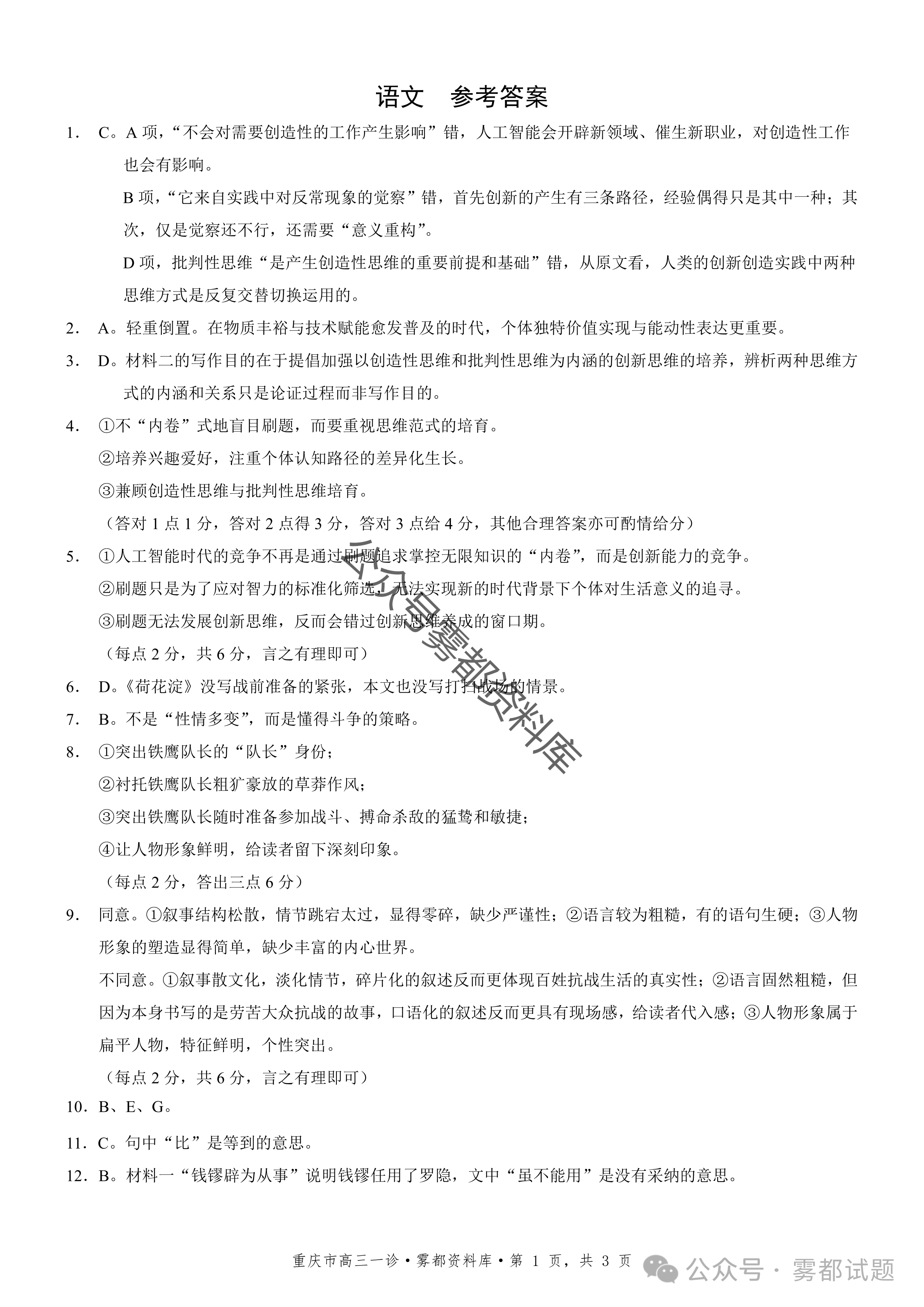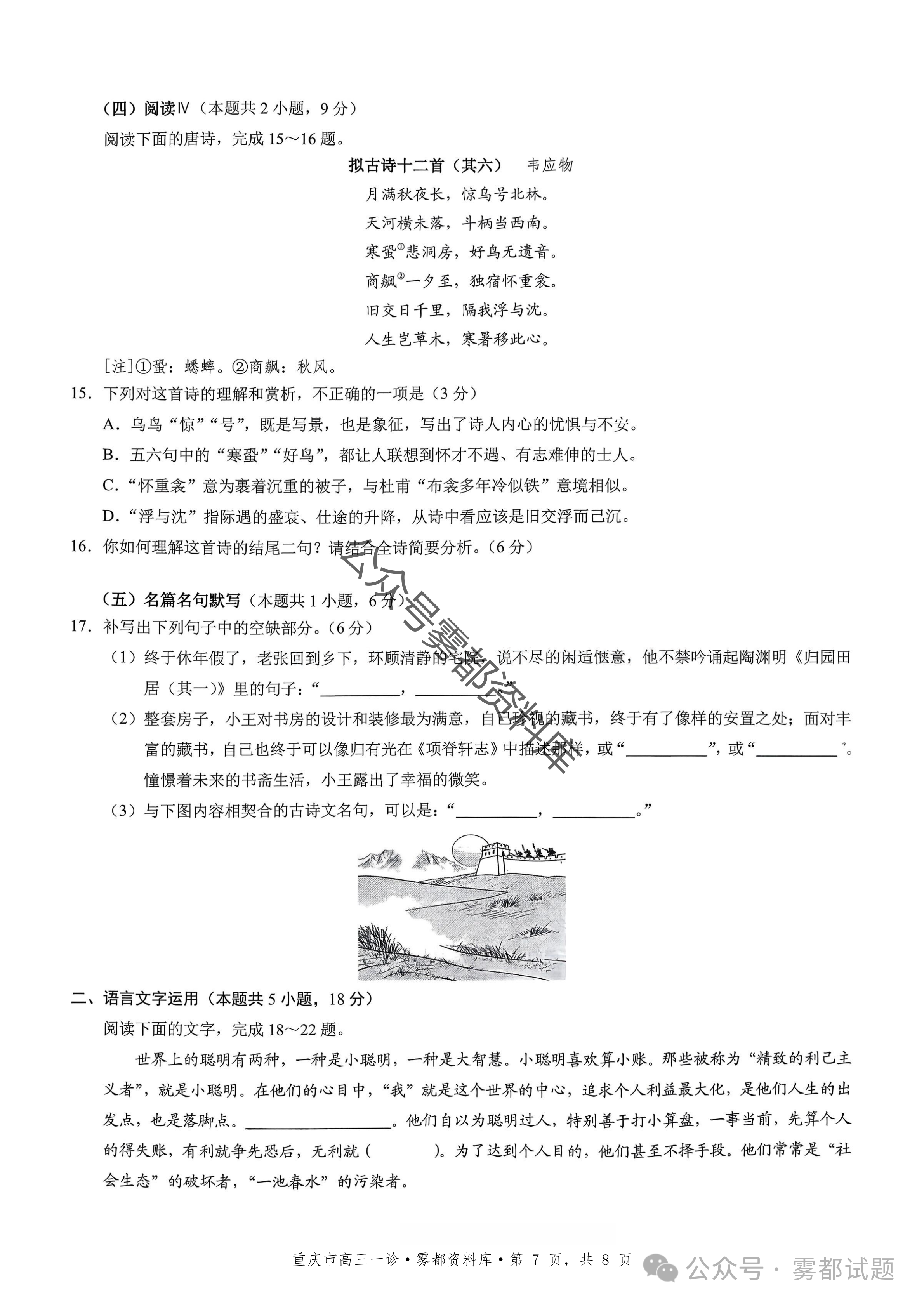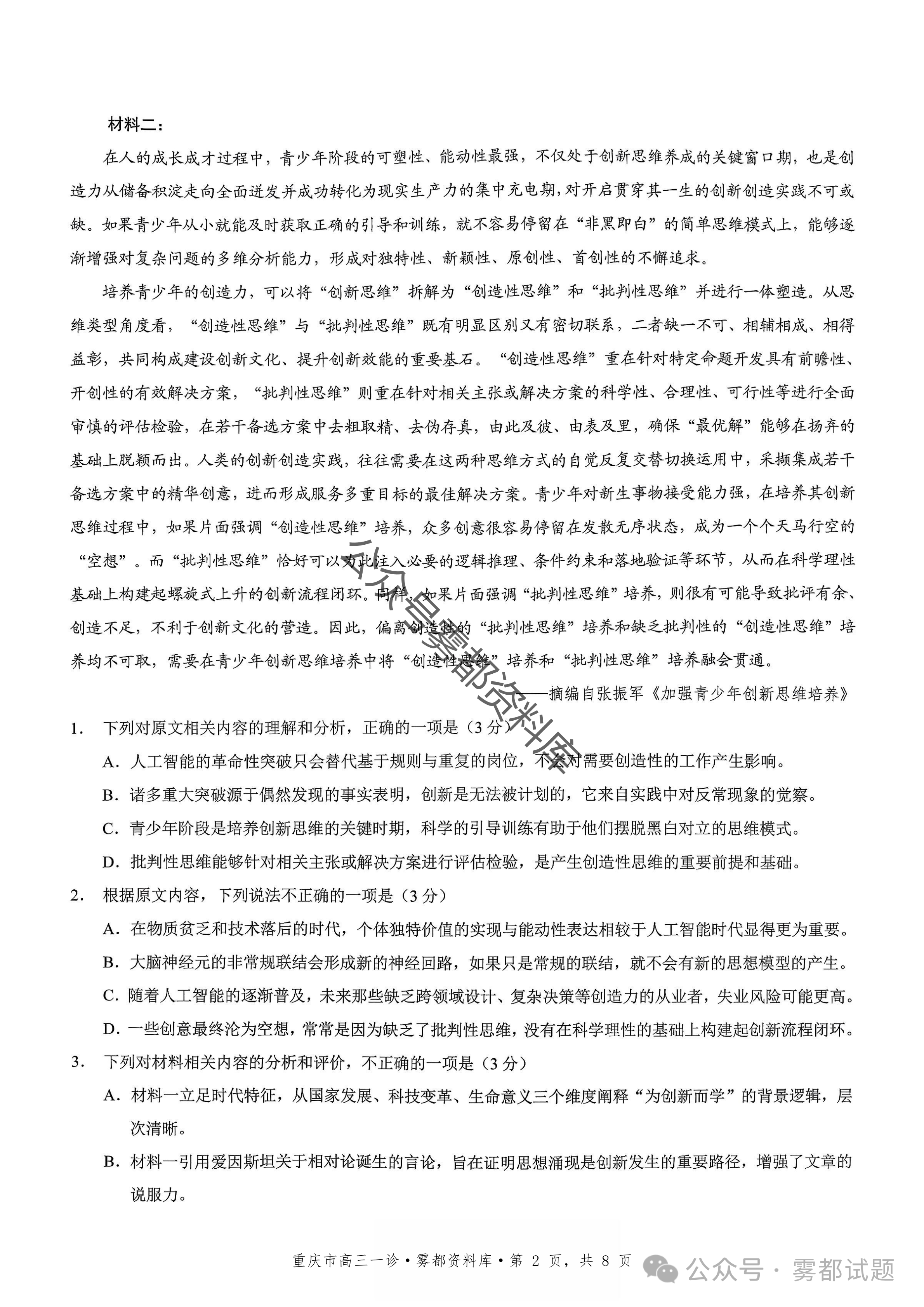 一、2026重庆市康德高三一诊语文试卷及答案