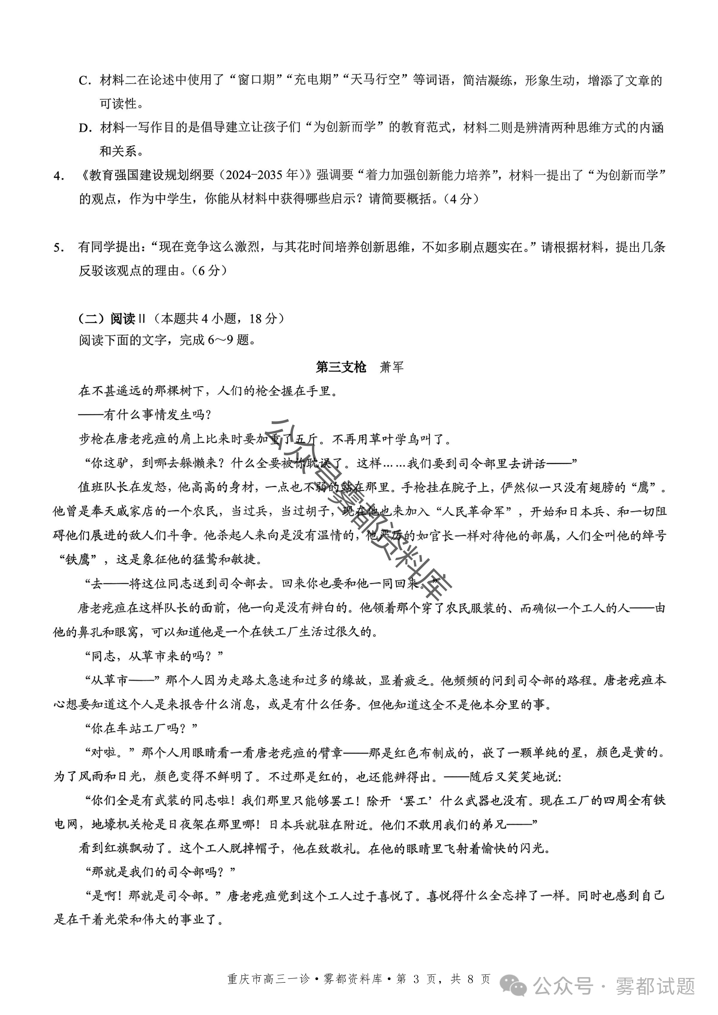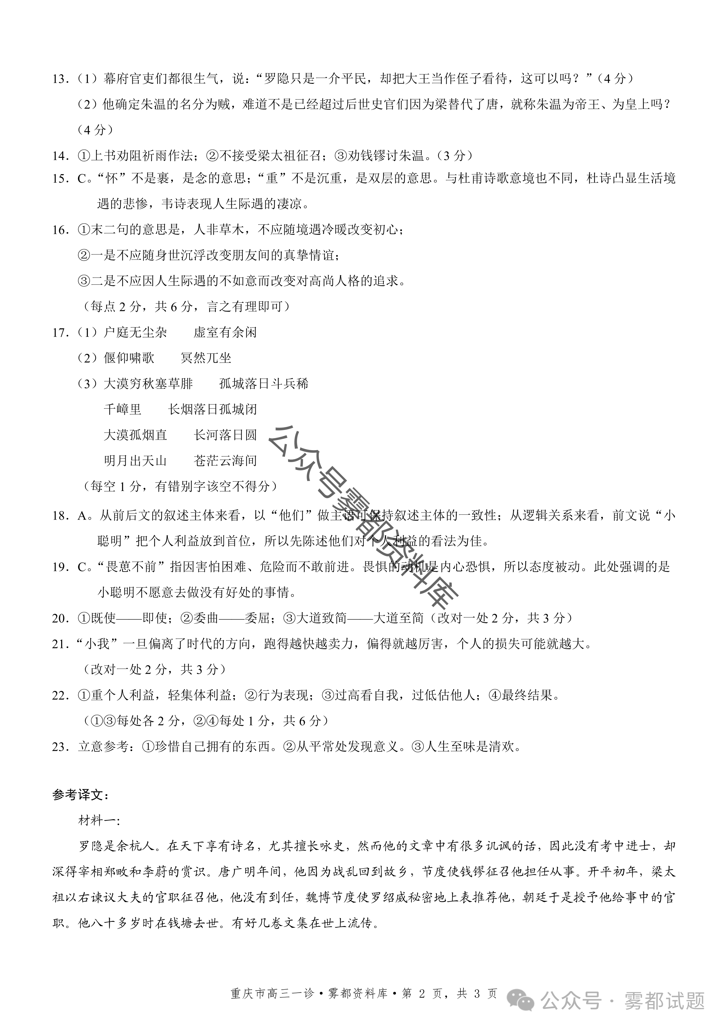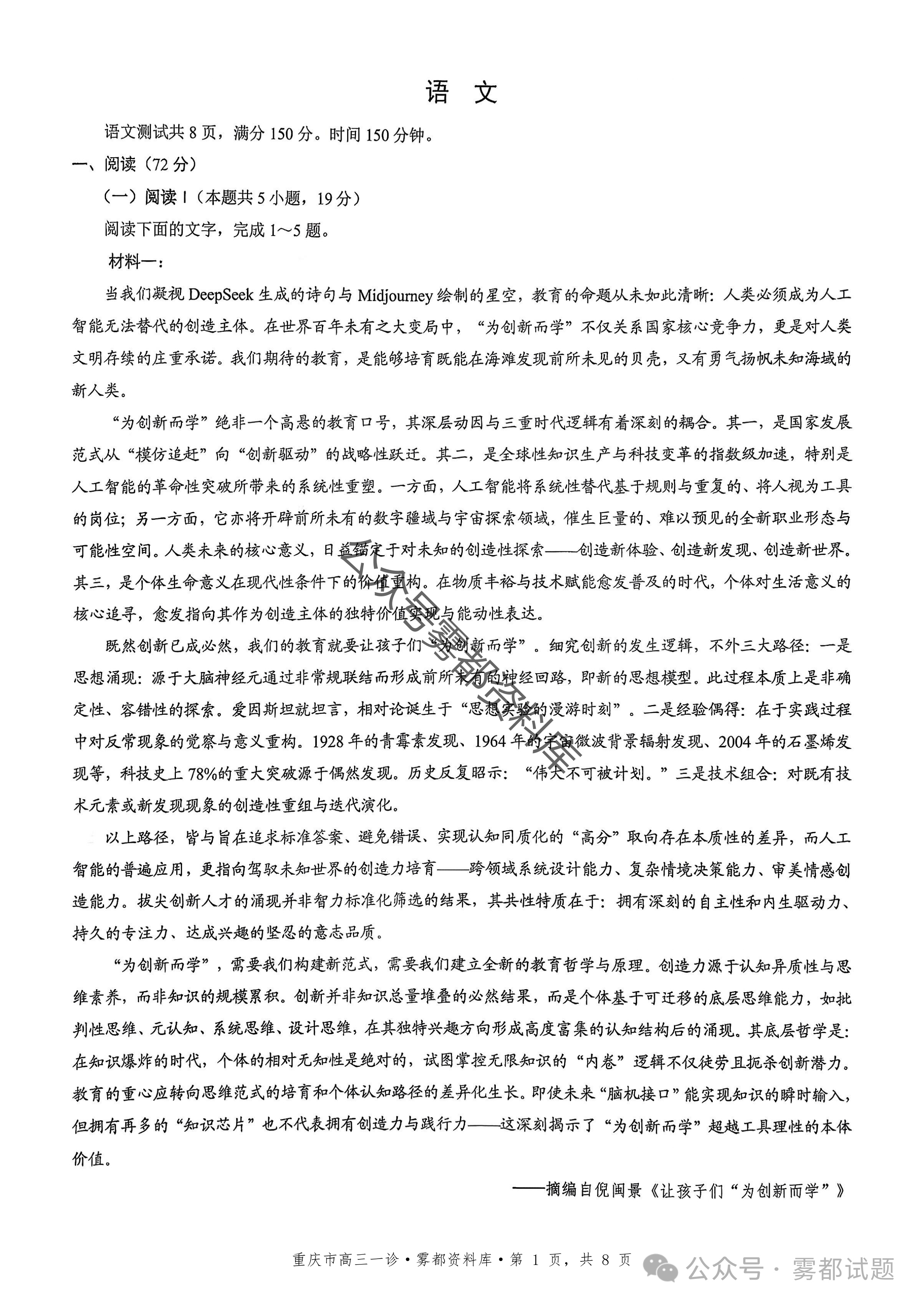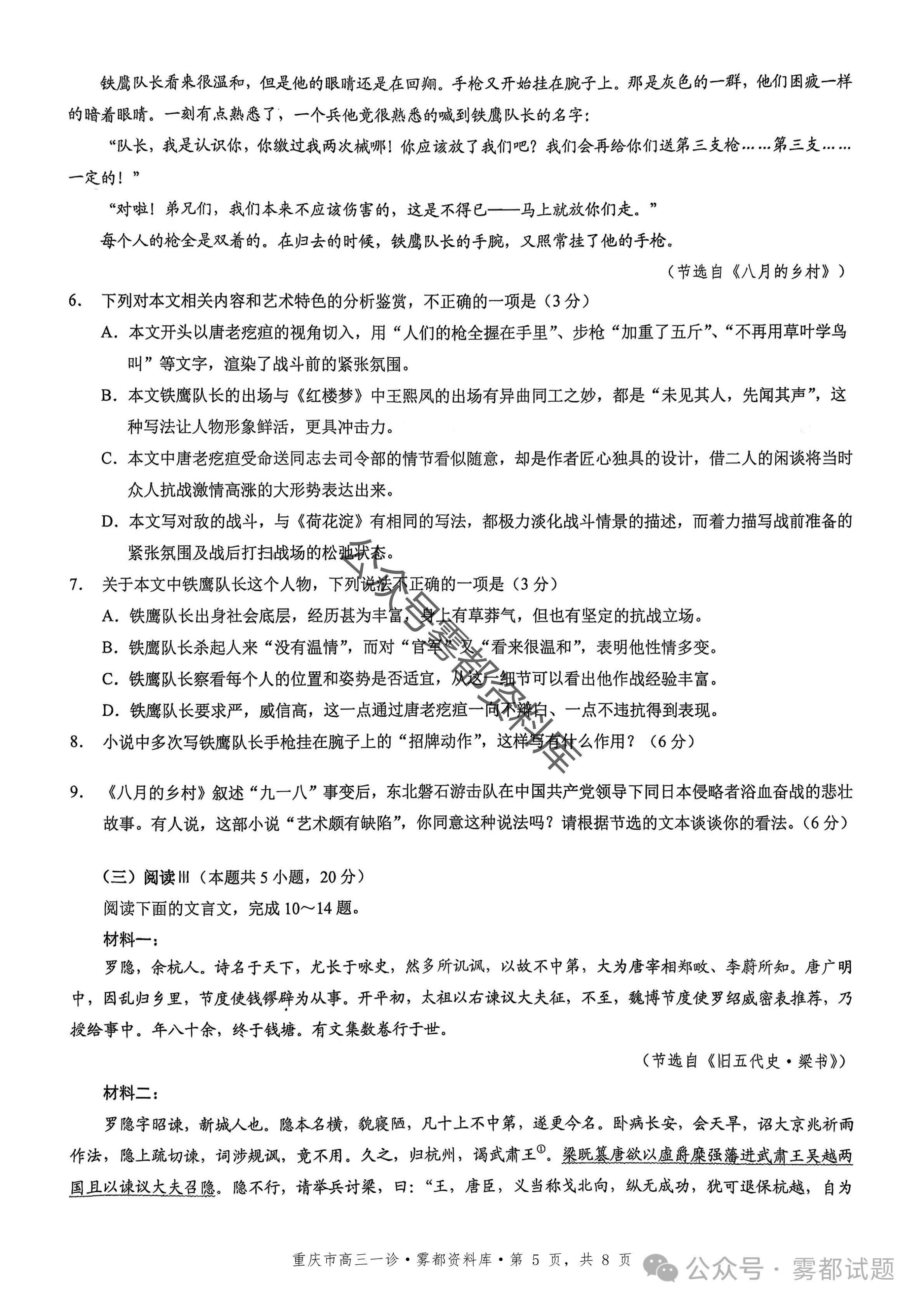 一、2026重庆市康德高三一诊语文试卷及答案