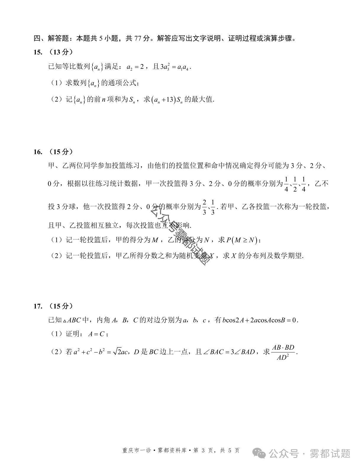 二、2026重庆市康德高三一诊数学试卷及答案