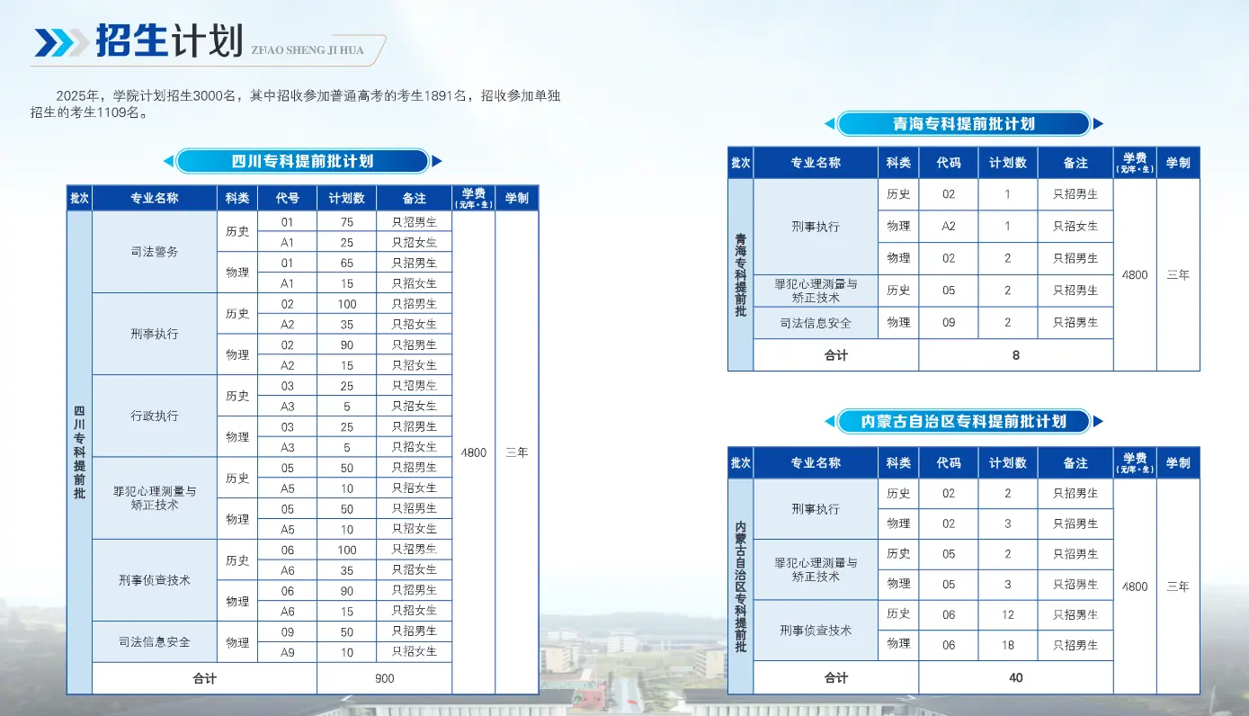 四川司法警官职业学院(内蒙古专科提前批)2025年共招收40人,招生专业包含了刑事执行、罪犯心理测量与矫正技术、刑事侦查技术。