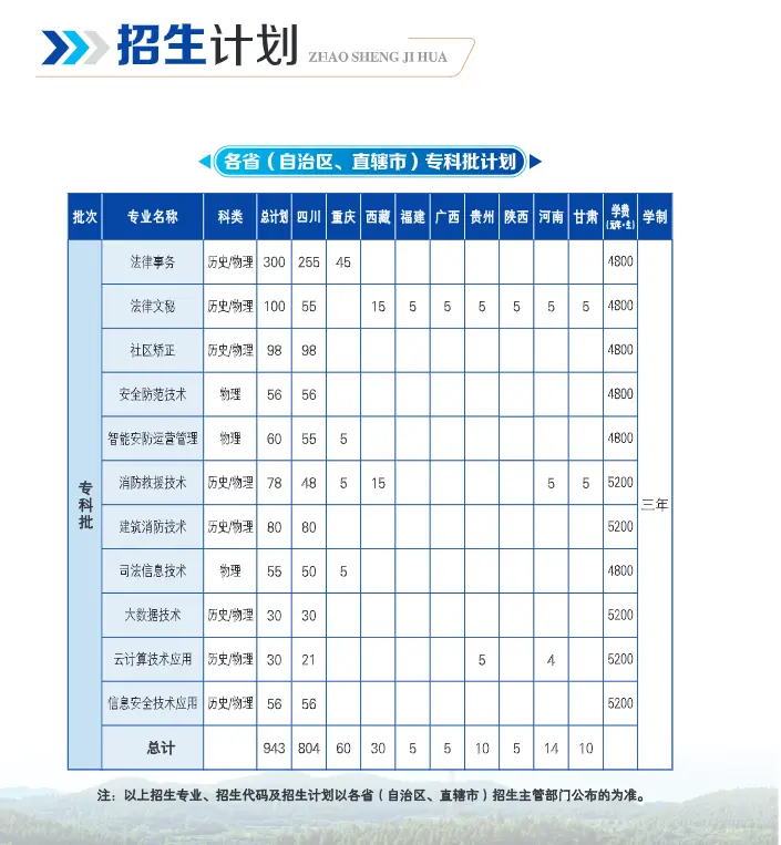 四川司法警官职业学院(专科批)2025年面向四川、重庆、西藏、福建等多个高考省市招生,共招943人,招生专业包含了法律事务、法律文秘、社区矫正、安全防范技术、智能安防运营管理、消防救援技术、司法信息技术、大数据技术、云计算技术应用、信息安全技术运用、建筑消防技术。
