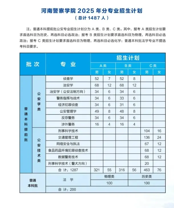 河南警察学院(公安类提前批)2025年共招1287人,招生专业包含了侦查学、经济犯罪侦查、治安学、涉外警务、刑事科学技术、食品药品环境犯罪侦查技术、网络安全与执法、数据警务技术、交通管理工程、反恐警务、公安管理学。