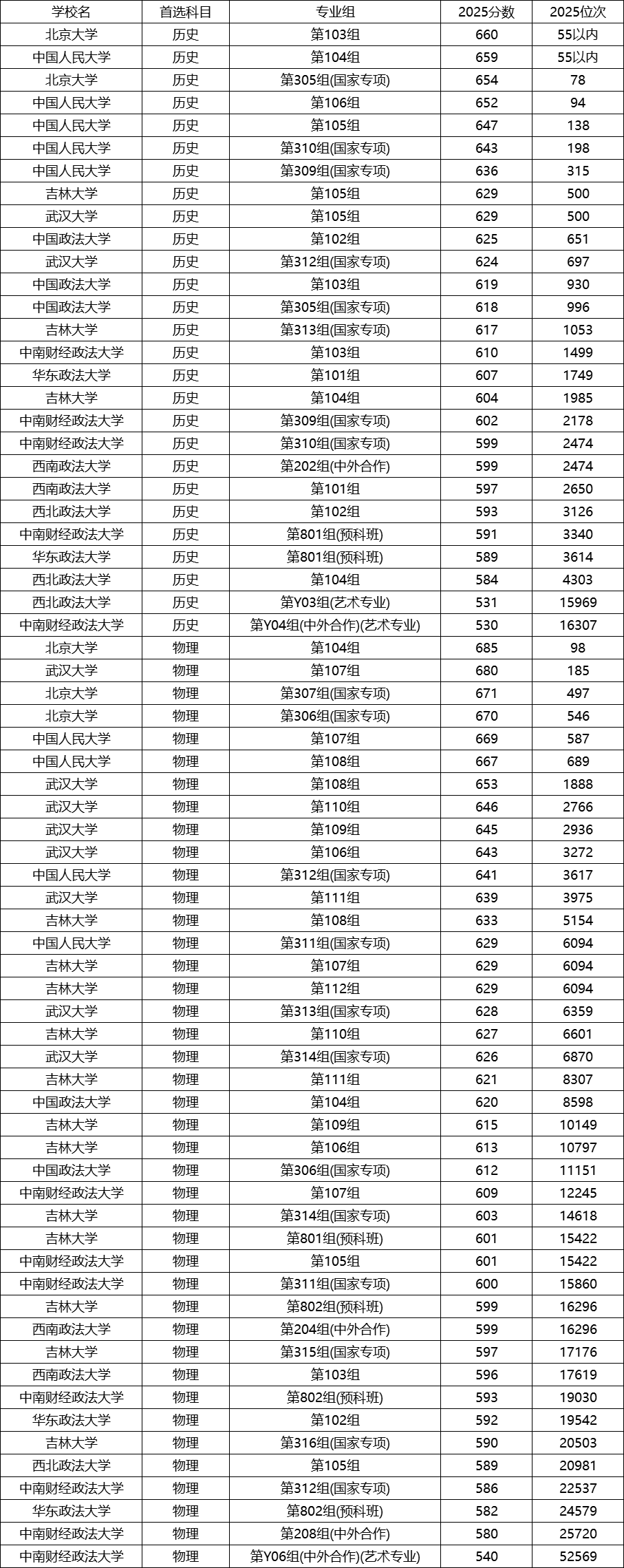 | 中南财经政法大学 | 历史 | 719组 (预科) |