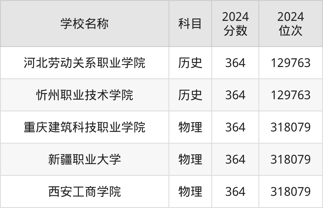 其中,物理组364分位于重庆的学校有重庆建筑科技职业学院。历史组364分位于河北的学校有河北劳动关系职业学院。