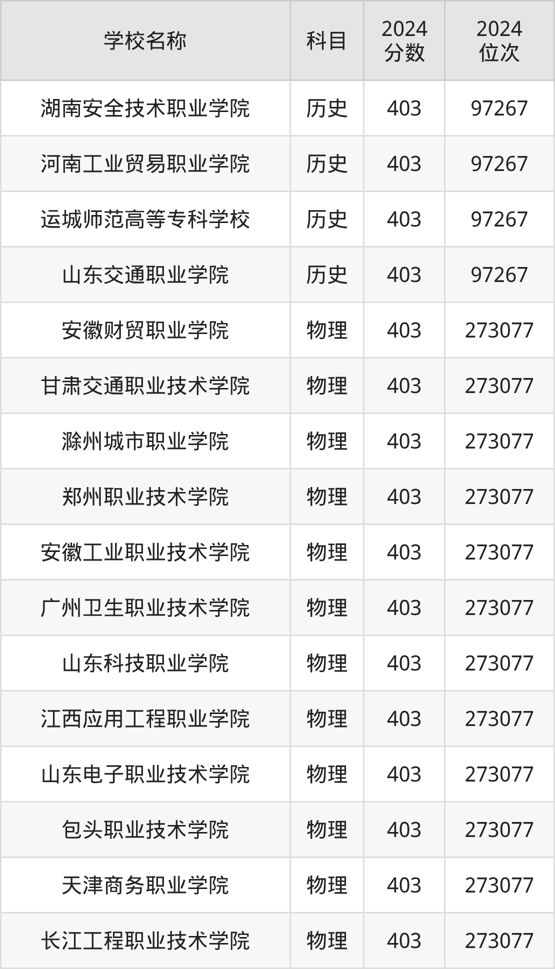 其中,物理组403分位于广东的学校有广州卫生职业技术学院。历史组403分位于湖南的学校有湖南安全技术职业学院。