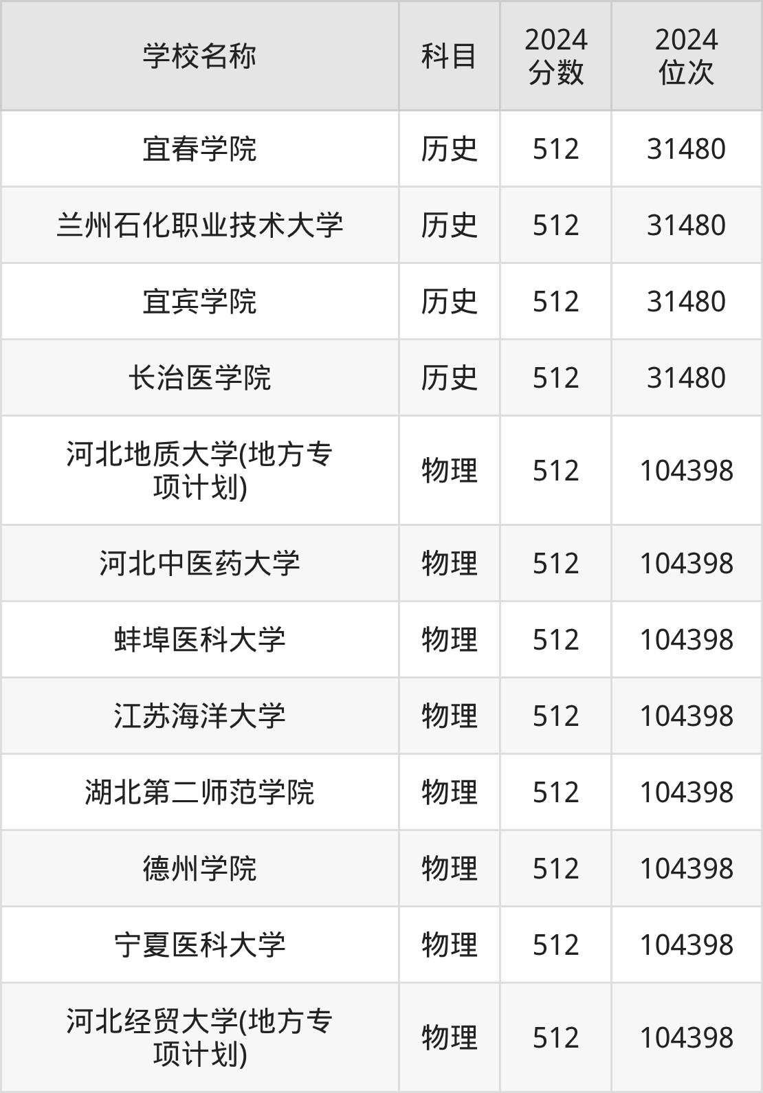 其中,物理组512分位于河北的学校有河北地质大学(地方专项计划)。历史组512分位于江西的学校有宜春学院。