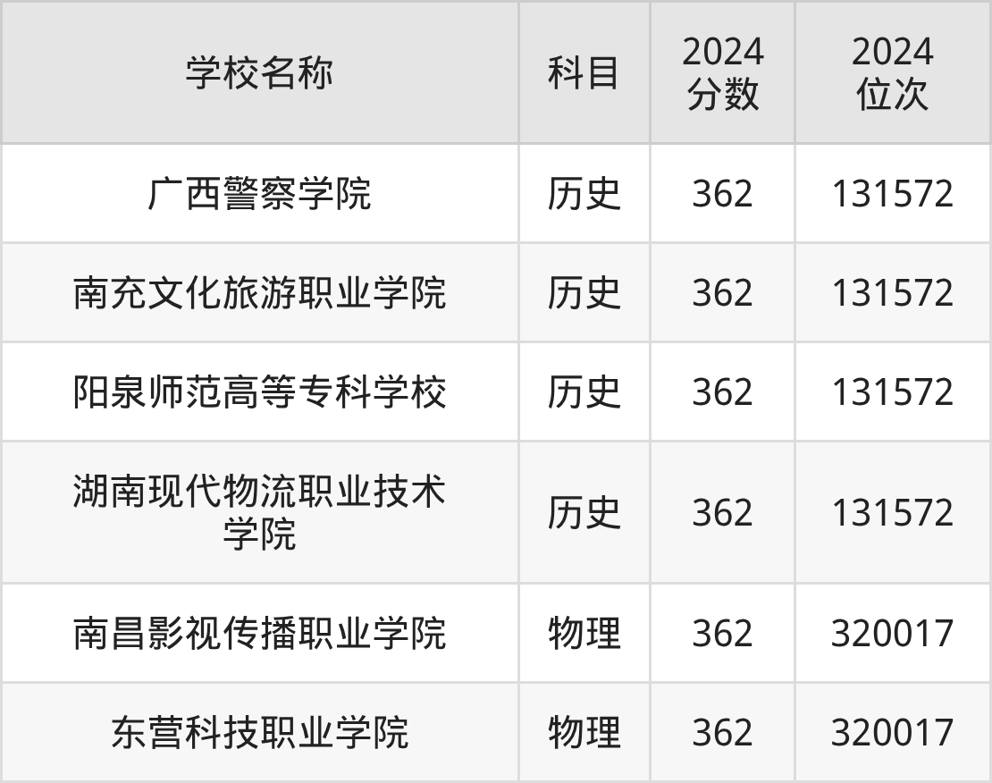 其中,物理组362分位于江西的学校有南昌影视传播职业学院。历史组362分位于广西的学校有广西警察学院。