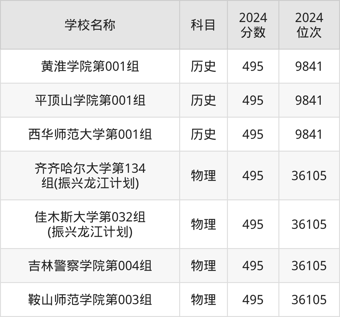 回看2024年黑龙江高考最低分为495分的文科大学名单,物理组有4条数据,历史组有3条数据。