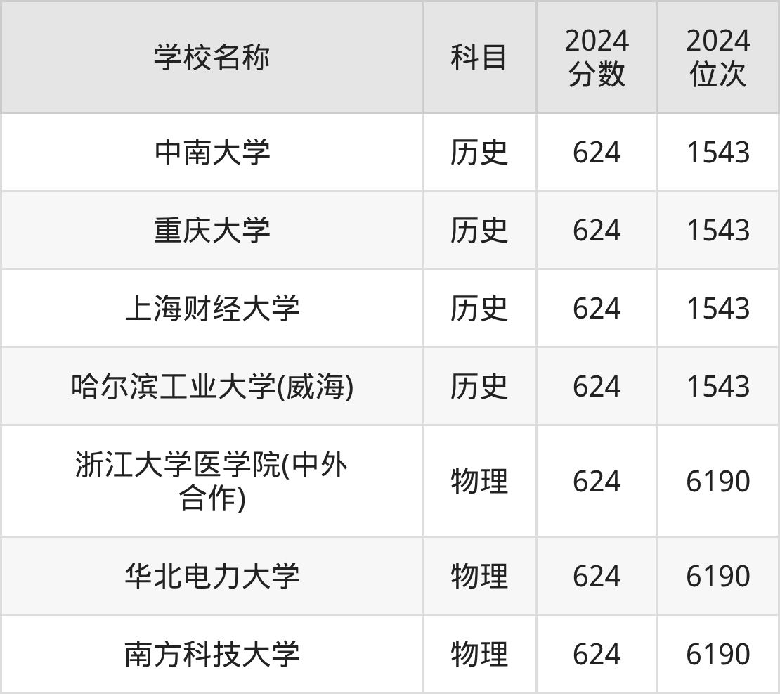 其中,物理组624分位于上海的学校有华北电力大学。历史组624分位于上海的学校有上海财经大学。
