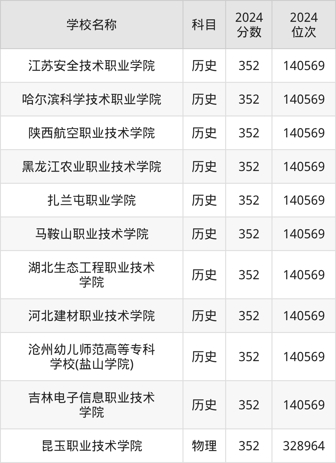 其中,物理组352分位于新疆的学校有昆玉职业技术学院。历史组352分位于河北的学校有河北建材职业技术学院。