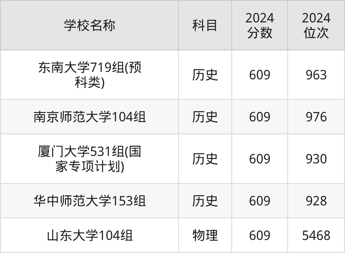其中,物理组609分位于山东的学校有山东大学。历史组609分位于江苏的学校有东南大学。