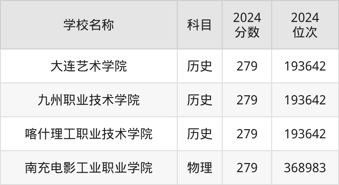 其中,物理组279分位于四川的学校有南充电影工业职业学院。历史组279分位于江苏的学校有九州职业技术学院。