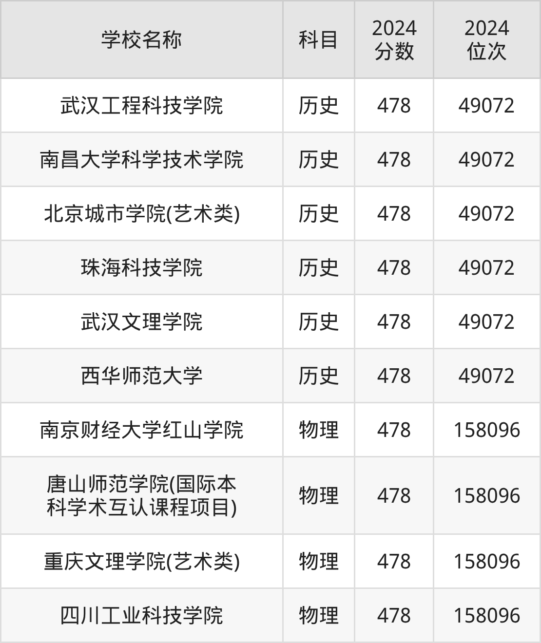 回看2024年河北高考最低分为478分的文科大学名单,物理组有4条数据,历史组有6条数据。