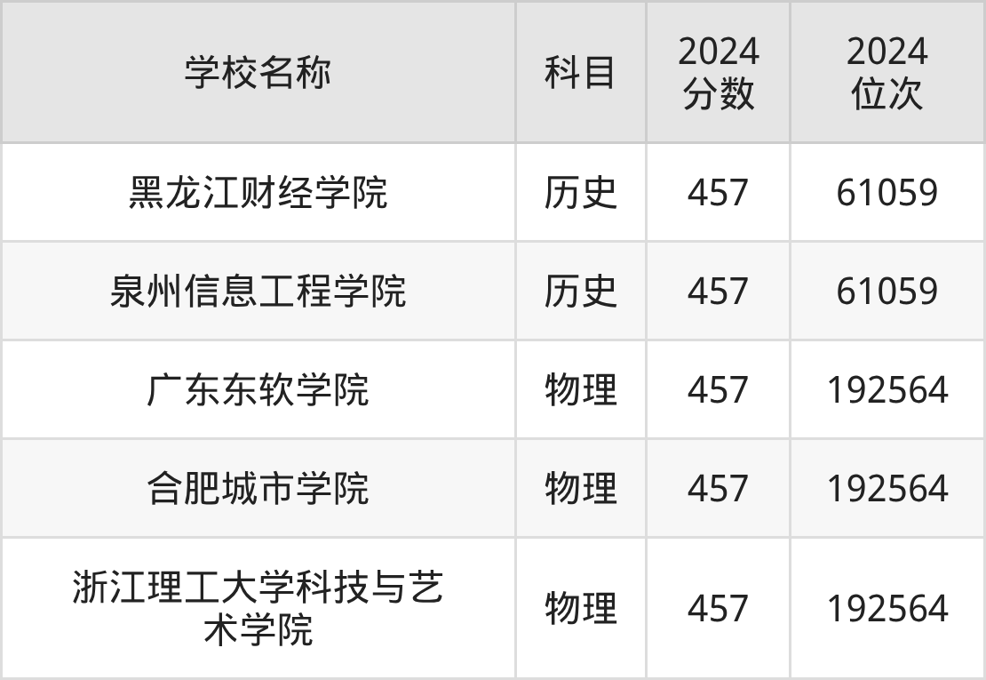 回看2024年河北高考最低分为457分的理科大学名单,物理组有3条数据,历史组有2条数据。