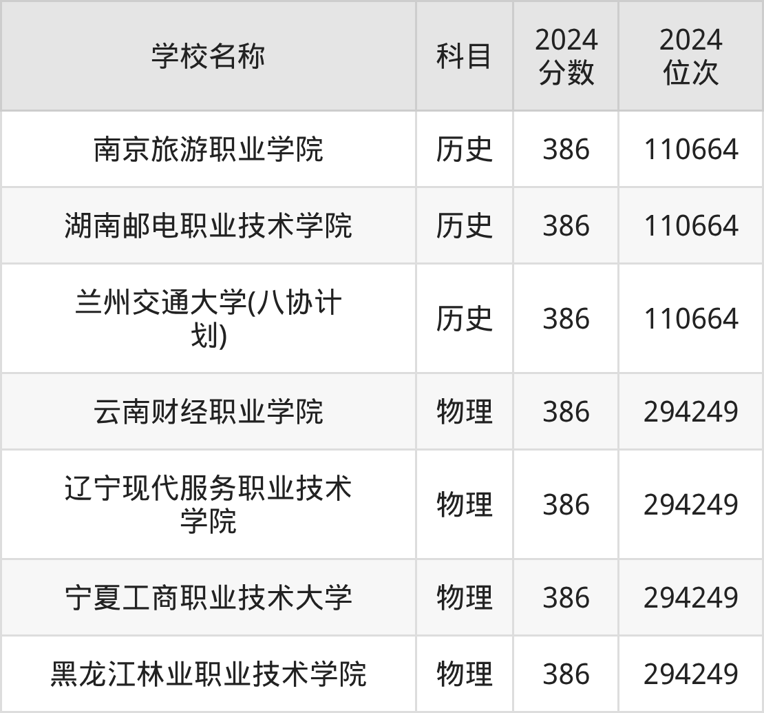 其中,物理组386分位于云南的学校有云南财经职业学院。历史组386分位于江苏的学校有南京旅游职业学院。