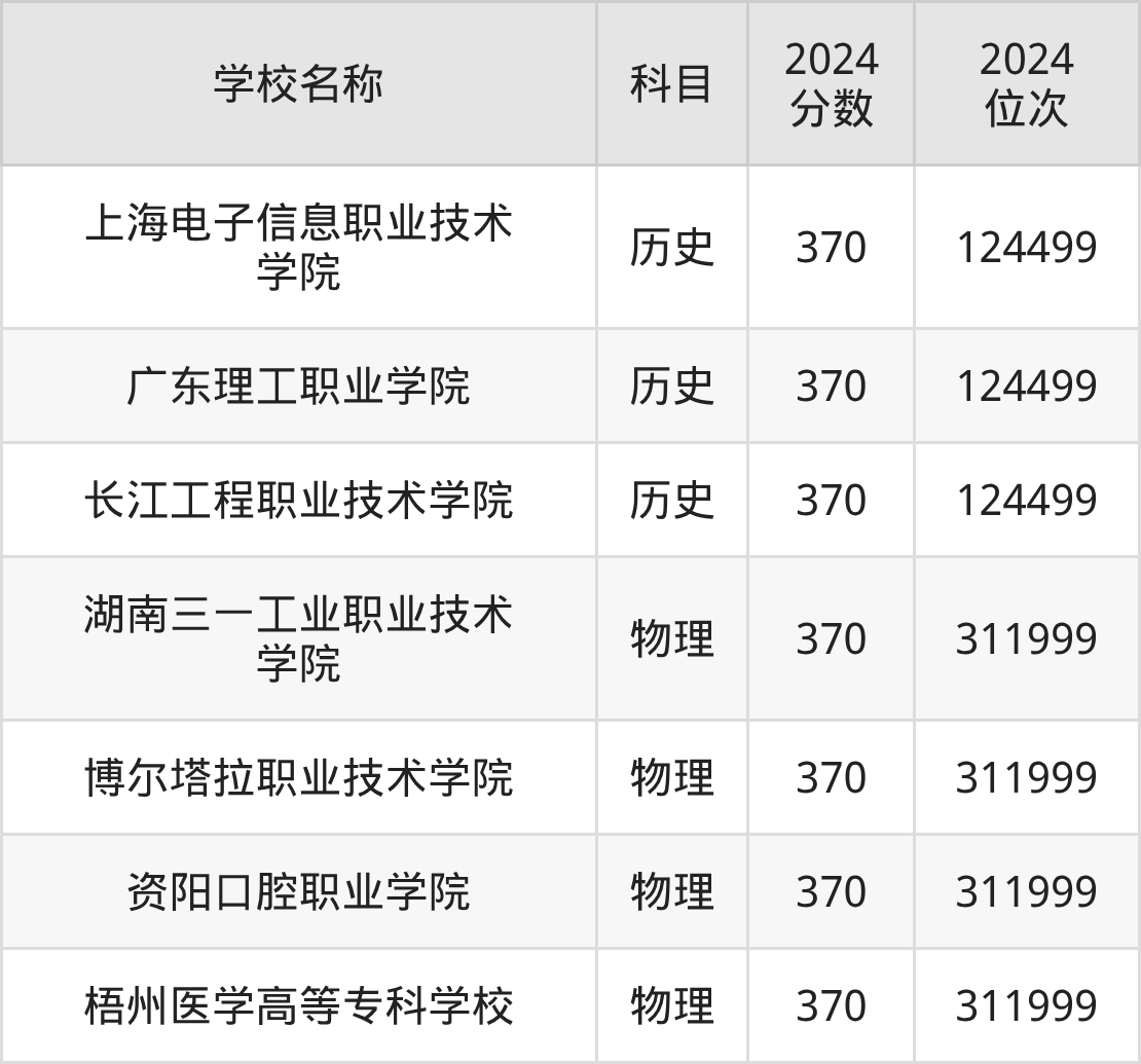 其中,物理组370分位于湖南的学校有湖南三一工业职业技术学院。历史组370分位于上海的学校有上海电子信息职业技术学院。