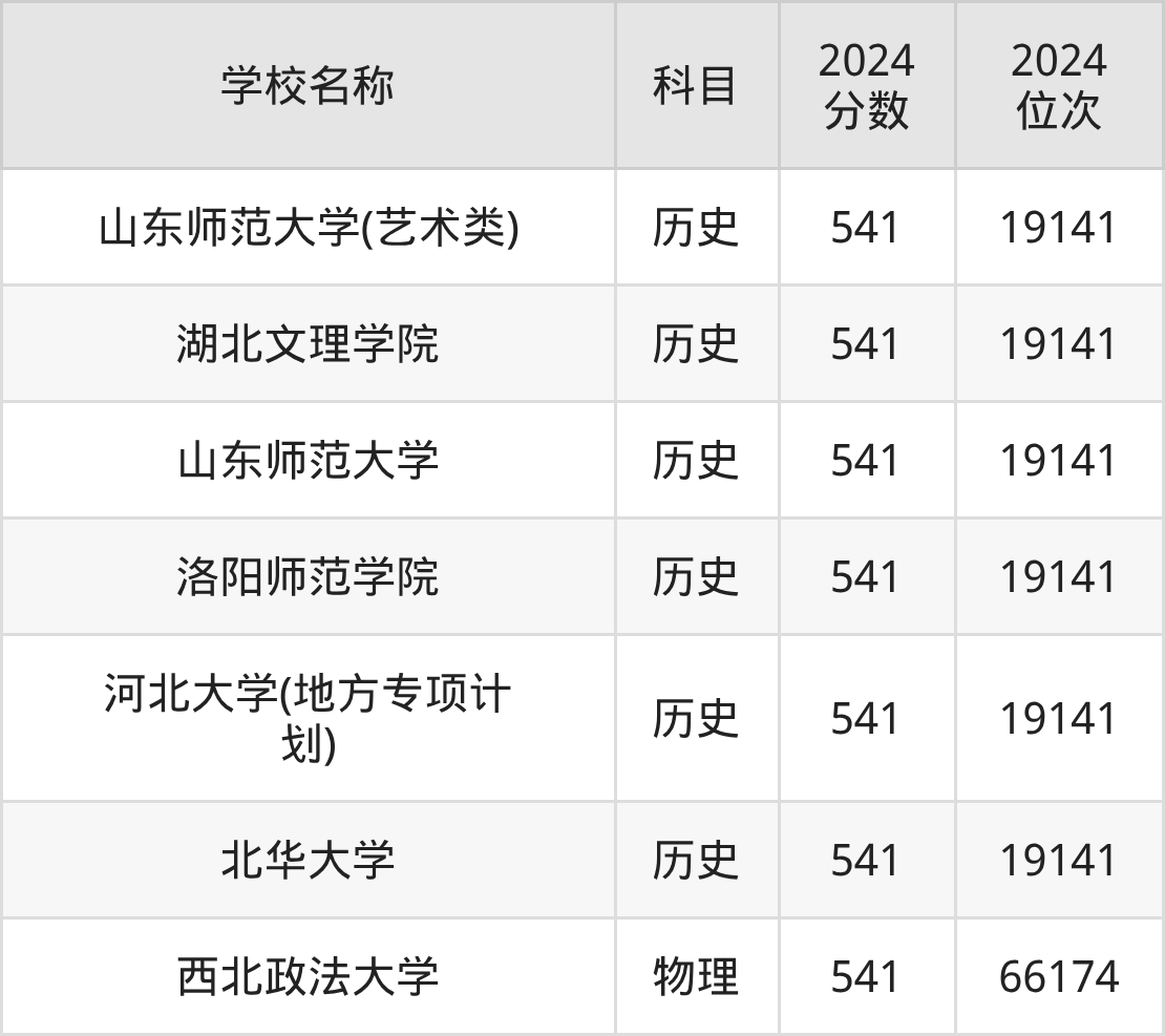 其中,物理组541分位于陕西的学校有西北政法大学。历史组541分位于河北的学校有河北大学(地方专项计划)。