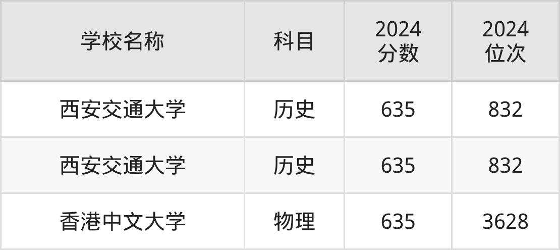 其中,物理组635分位于的学校有香港中文大学。历史组635分位于陕西的学校有西安交通大学。