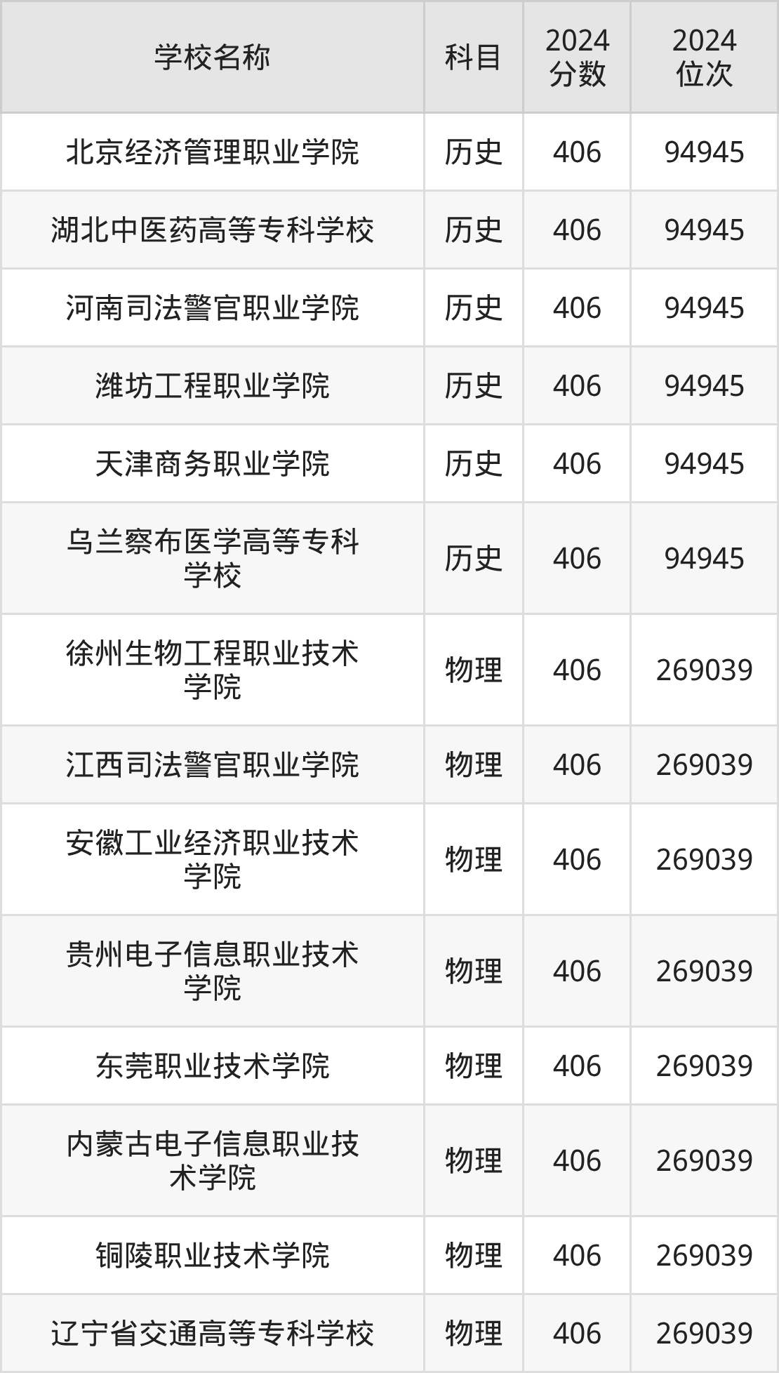 回看2024年河北高考最低分为406分的公办大专学校名单,物理组有8条数据,历史组有6条数据。