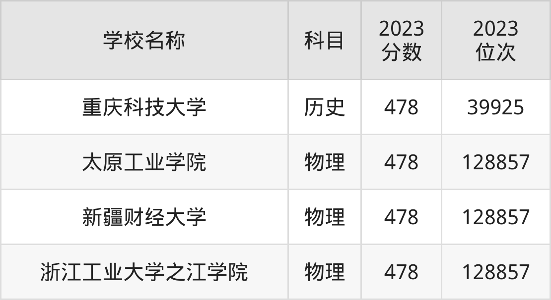 其中,物理组478分位于浙江的学校有浙江工业大学之江学院。历史组478分位于重庆的学校有重庆科技大学。